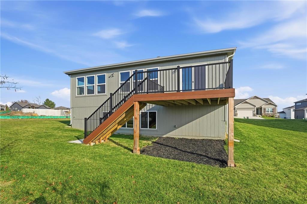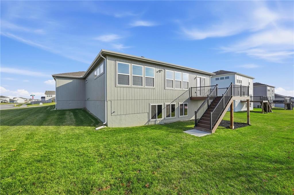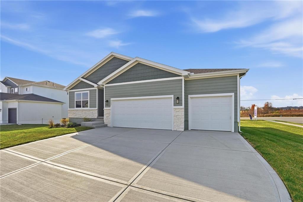 The “Harmony” plan by Avital Homes is available for quick move-in! Where the beauty of open-concept living meets the ease of single-story luxury. This 3-bedroom, 2-bath ranch plan welcomes you with an open staircase and seamlessly integrates spacious Living, Dining, and Kitchen areas for a harmonious living experience. This home will feature a cozy fireplace in the living room (not pictured) and the Dazzling & Devine professionally curated design package. The primary suite takes convenience to the next level, effortlessly connecting to the laundry room. Explore the option of adding an additional level of comfort with the lower-level finish, offering a spacious Rec Room, an extra bedroom, and bath. Experience the perfect blend of simplicity and sophistication in the art of harmonious living. Exterior photo is actual home. Features upgraded laundry room floor tile and upgraded kitchen backsplash tiles. Stoney Creek HOA is only $640 annually and includes trash, recycling, planned social activities, clubhouse, 3 pools, walking trails, playground, volleyball and sidewalks adjacent to Osage Trails Park.