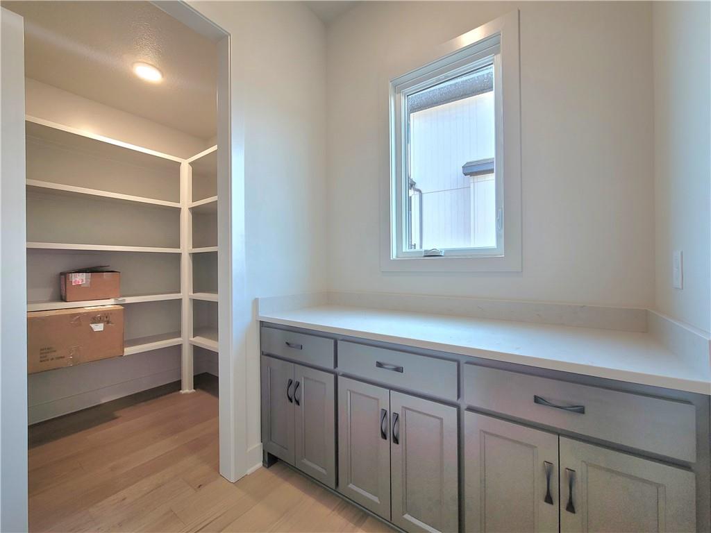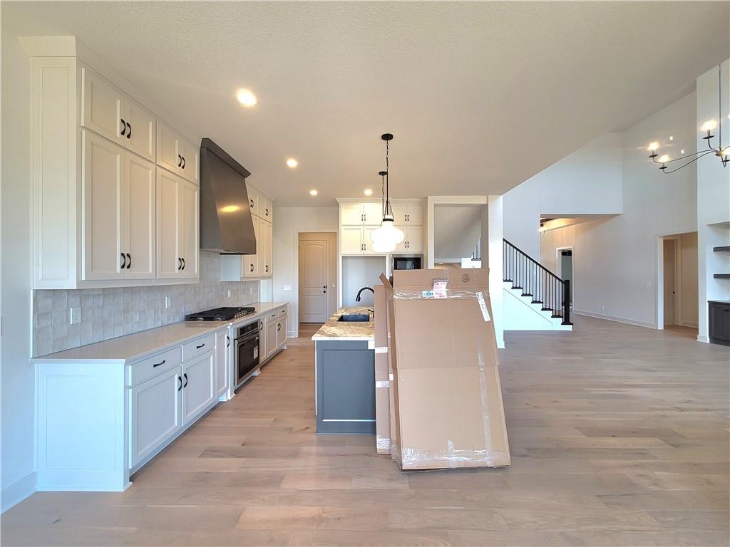 The new Aspen floor plan by Coventry Builders. New construction home is complete and move-in-ready. This 4 bedroom + Loft, 4.5 bath, 1.5 Story home features a large front porch. The Great Room has a soaring two story ceiling and the open living area is complete with a beautiful fireplace, built-ins, and tons of natural light. The kitchen has lots of cabinet and countertop space and a huge island. The large pantry is adjacent. Beams in the Dining room ceiling add to the WOW and the Dining room opens to the large covered deck. The main level features a 2nd bedroom with it's own bath and walk-in closet. The spacious main level Primary Bedroom opens to the luxurious Mbath with a walk-in shower and free-standing tub. The large Master closet features plenty of storage possibilities. Connected to the master closet is the laundry room with a quartz countertop. The second level features a large loft that overlooks the Great Room. There are two additional spacious bedrooms on this level. This home is on a Daylight lot, has a 3 car garage and a large covered deck. Don't miss seeing this home! Community amenities are open and include: clubhouse w/ fitness room, dog spa, gathering room and catering kitchen; 4 pools including a zero entry outdoor pool, outdoor kiddie pool, Indoor lap pool and indoor machine pool; sport court for basketball and pickleball, and playground. The new Blue Valley elementary school, Aspen Grove, is located in the center of the community.