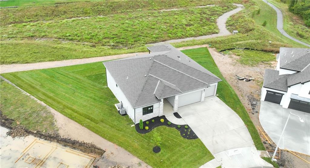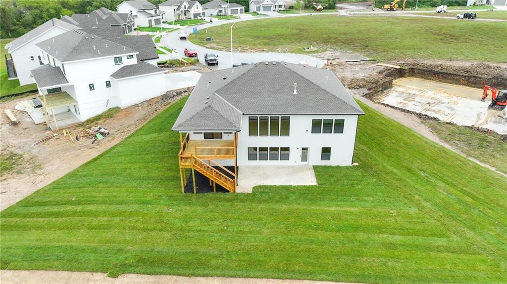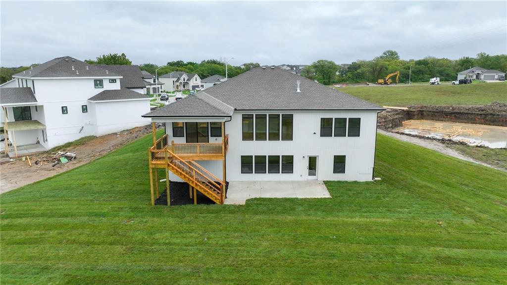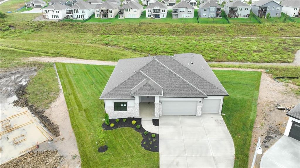 MOVE-IN READY! The Ashton by Hearthside Homes – Reverse 1.5 Story on a Walkout Cul-de-Sac Lot in Cadence. This thoughtfully designed home offers over 3,100 sq ft of elevated living with 4 bedrooms and 3 full baths, blending comfort, craftsmanship, and modern design. The open main level features vaulted ceilings with white oak box beams, wide-plank hardwood floors, and a striking black tile fireplace. The kitchen impresses with quartz countertops, built-in appliances, an expansive island, range hood, under-cabinet lighting, and a black Silgranit sink—balancing form and function. The primary suite delivers a true retreat. The luxurious bath features a beautifully designed wet area with both a soaking tub and a tiled shower—offering a spa-like experience—plus dual vanities and a large walk-in closet. The main-floor office with custom cabinetry and floating shelves provides an ideal workspace. The finished walkout lower level includes a spacious rec room with wet bar, two bedrooms with walk-in closets, and a full bath. Upgrades include an I-joist floor system for solid, quiet floors, black windows, a 16x12 covered deck, and an oversized patio overlooking greenspace for private outdoor living. Cadence offers amenities including a community pool, scenic walking trails, and walkability to Platte Purchase Park. Every Hearthside home includes a 12-month builder warranty, independent third-party inspections, a verified video sewer line scope, and professional HVAC duct cleaning—ensuring your new home is delivered in pristine, top-tier condition. Located within the North Kansas City School District and the Staley High boundary. Taxes, square footage & room sizes are approximate.