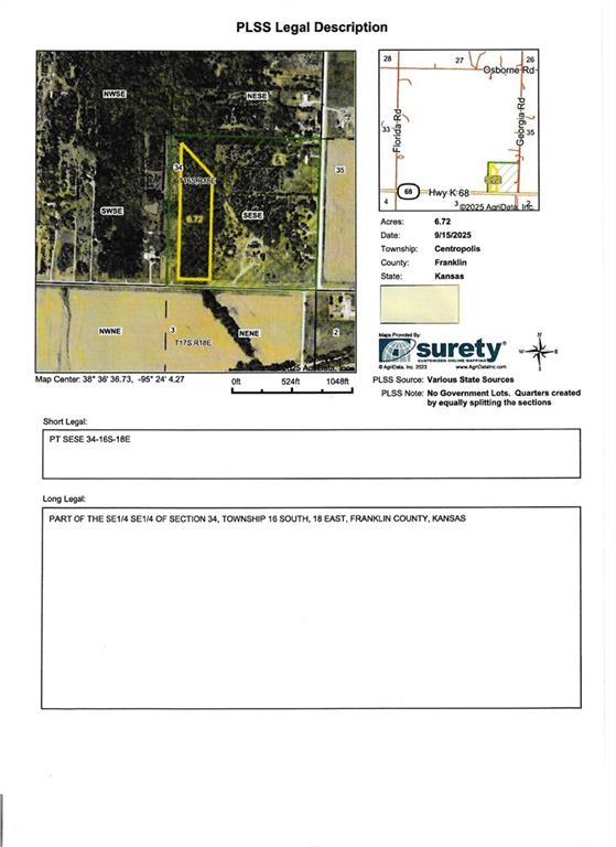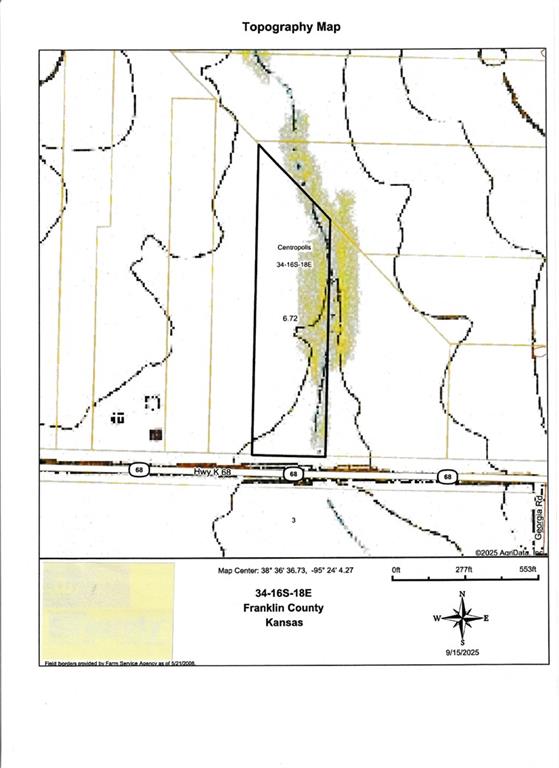 Heavily Wooded 6.7 Acres located on K-68 Hwy. This is an inherited property and Seller has very limited knowledge. There is a Water Well but there is no pump. There was an old septic tank but Seller has no knowledge of it. There use to be a small pond toward the NE corner of property but Seller has not been on the property in years. There is a 25 x 12 Shed built in 1980. There is no easement to the property at this time but Seller is in the process of acquiring an easement on an existing driveway that adjoins the property on the West in the SE corner of adjoining property and has been used for many years but there was never an easement for this property. There is no Sellers Disclosure. Property is in the 100 year flood plain. There is a creek on the property Aerial map, created with Surety Pro paid subscription & used with permission from AgriData, Inc.