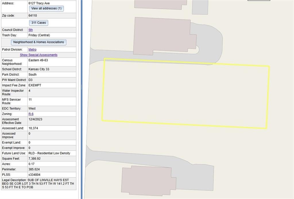 Two adjoining vacant lots offered together at 6127 & 6129 Tracy Ave, Kansas City, MO. Combined size approx. 10,600 sq ft (0.24 acres). Zoned R-6 Residential, allowing single-family construction (meets minimum lot size). Lots are level, cleared, partially fenced, with utilities available at street (buyer to verify). Great central location near UMKC, Rockhurst, Troost Corridor, and Hwy 71. Quick drive to Downtown, Plaza, and Brookside. Ideal for builder, investor, or custom home site. Rare chance to secure a double lot in an up-and-coming neighborhood. The lots at 6127 Tracy Ave and 6129 Tracy Ave, Kansas City, MO 64110, will be sold together as a package. Please refer to MLS # 2575726.