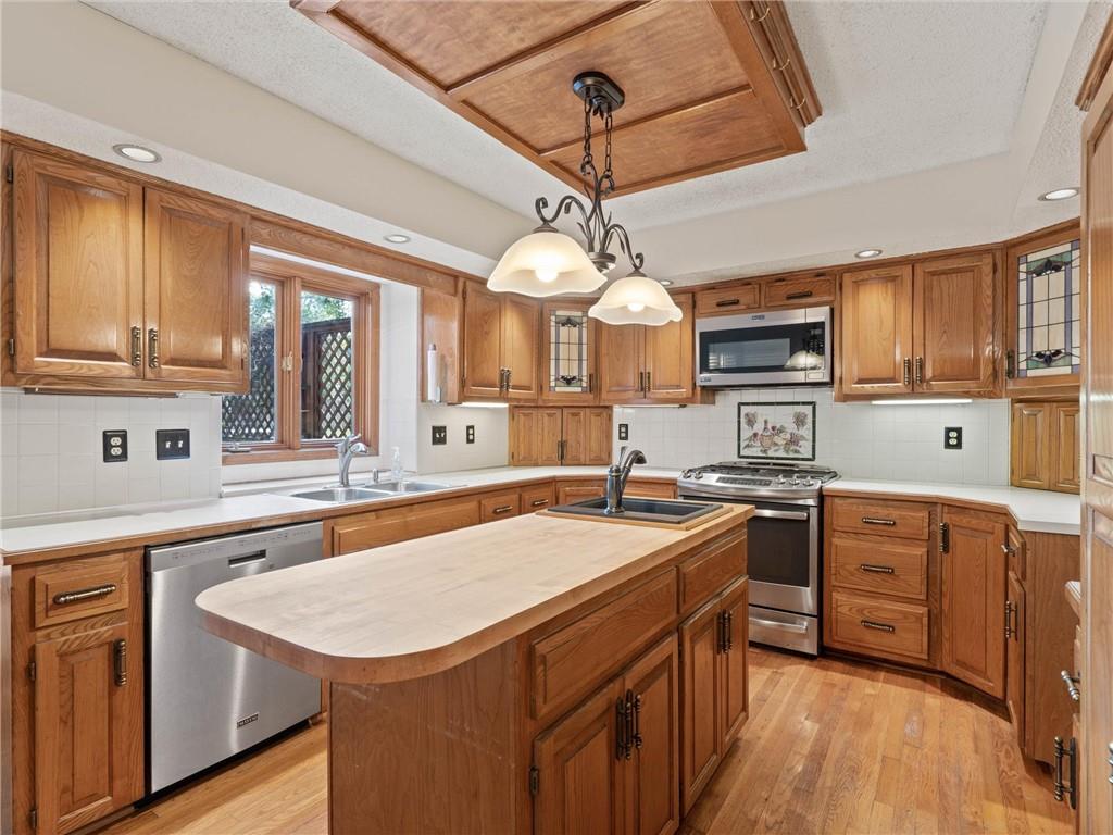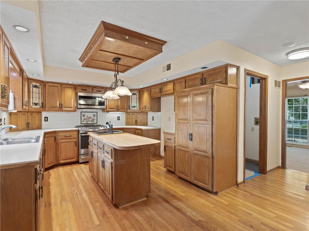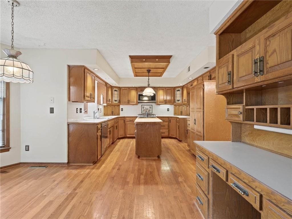 Need more space? This one is for you! More than 3,500 sf of livable space with a walkout basement on a .4 acre lot! The potential in this home is endless – the main floor features a den/office, formal dining room, spacious living area with fireplace and built-ins, half-bath, and the huge kitchen with breakfast area, island, and pantry. Upstairs, there are two secondary bedrooms, a full bathroom and the incredible primary suite complete with a sitting area with fireplace, dual vanities, separate jetted tub and shower, and massive walk-in closet ready to turn into your dream dressing room. There’s an additional entry through this closet to the 4th bedroom making it ideal for another office, nursery, home gym, or countless other possibilities. The walkout basement has a large rec space with another fireplace, a non-conforming 5th bedroom, full bathroom, storm room, and ample storage and workspace. All front windows were replaced in 2023 and include transferable warranty. New decking in 2024. Dishwasher replaced in 2020. New microwave in 2024. New carpet in basement and NE bedroom. New vinyl flooring in the basement bathroom and in the mud room off the garage. New fencing in 2023. Fantastic neighborhood with Brookhill Park right around the corner and the community pool and tennis courts minutes away. Just 15 minutes to downtown KC, close to great restaurants, stores, services, and easy access to highways - this location can’t be beat!