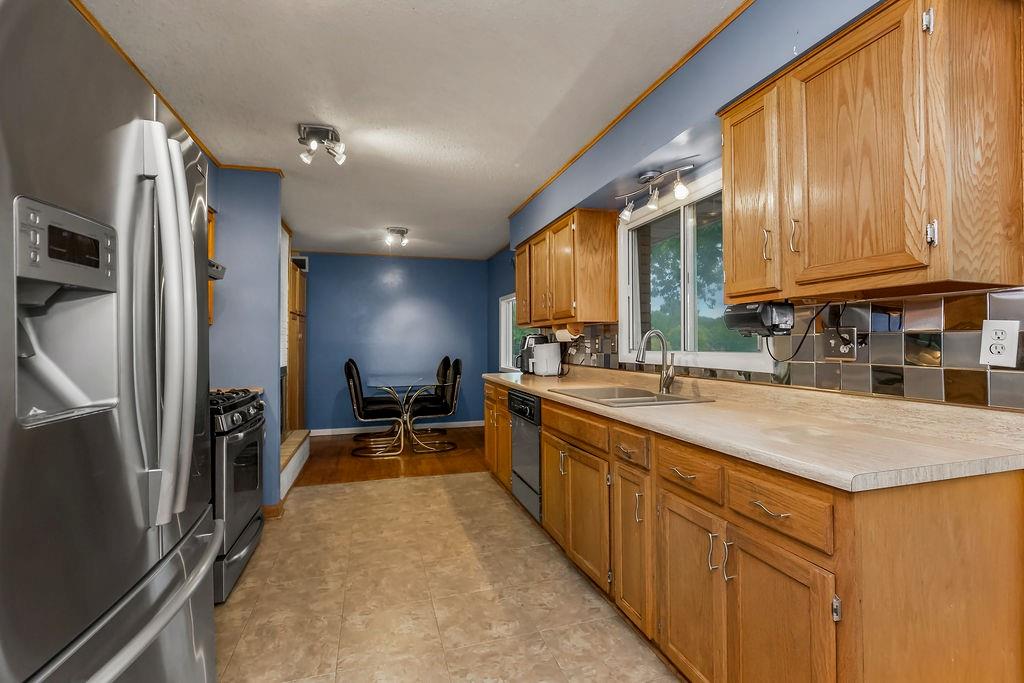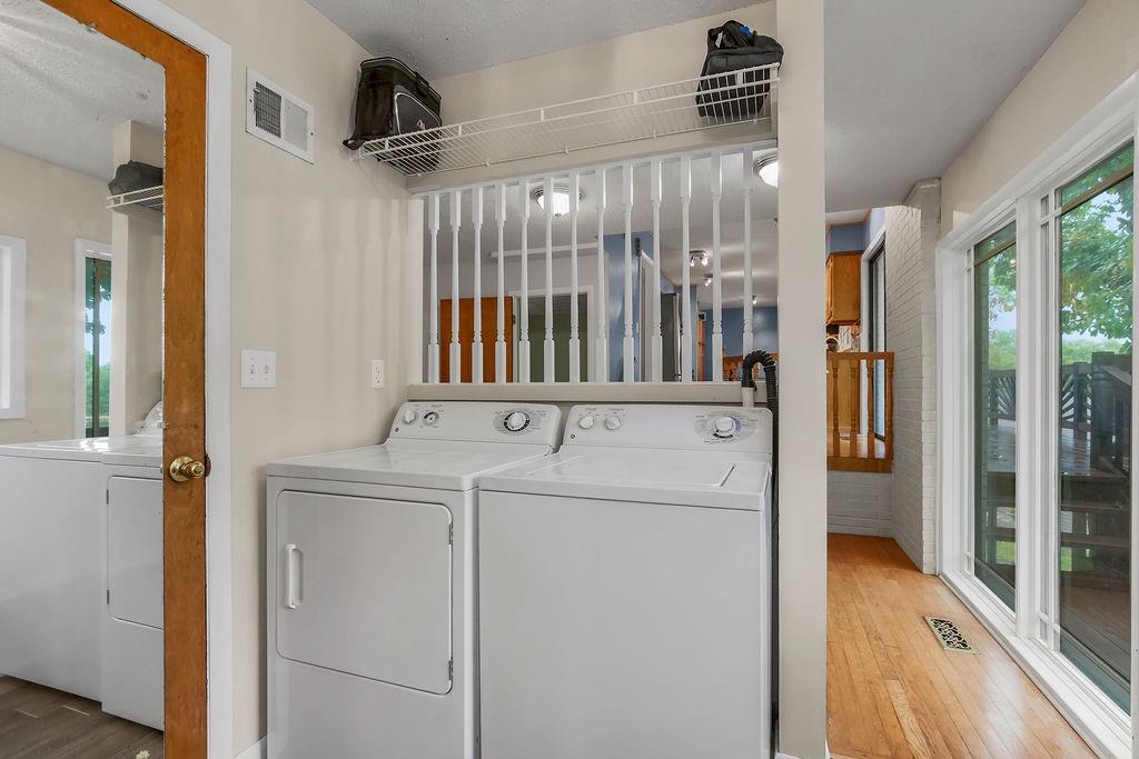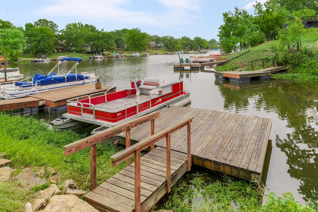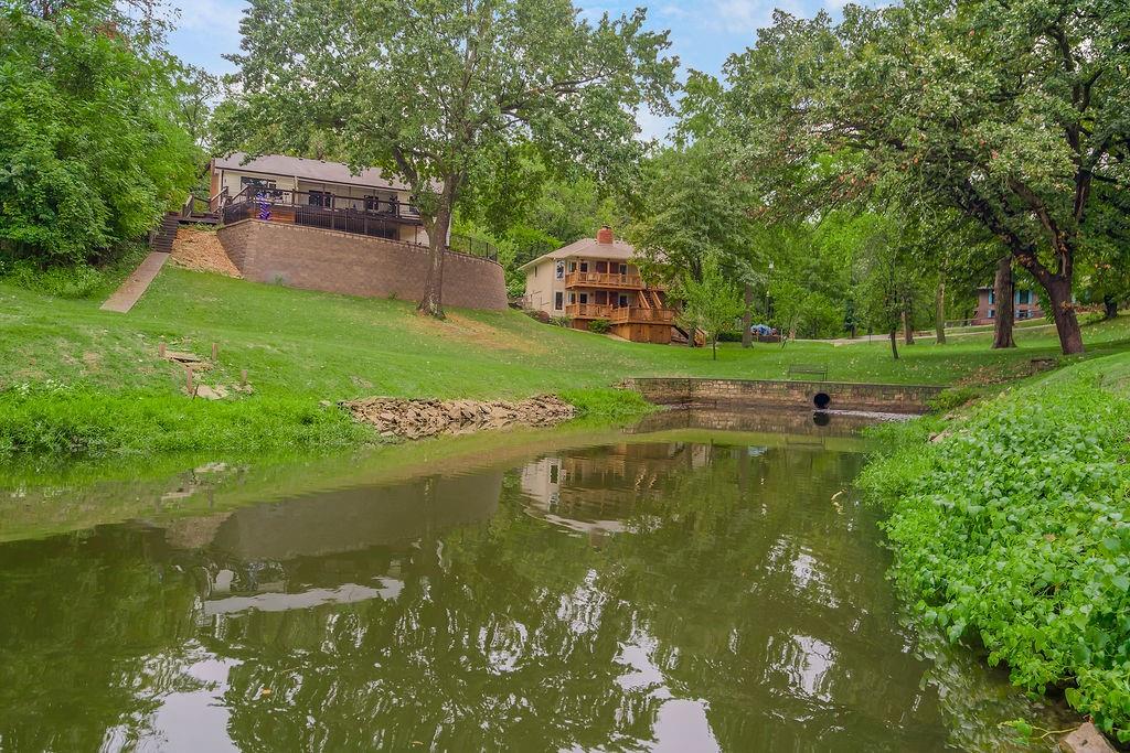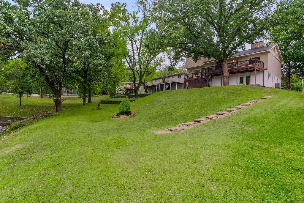 Welcome to LAKE FRONT @ Lake Waukomis —Lake Living in the city! This 3-bedroom, 2-bathroom home is filled with character and lake views. The double-door entry leads into a spacious living room featuring wood floors, vaulted ceilings with wood beams, a bay window, and a see-through fireplace connecting to the kitchen. The kitchen is equipped with stainless steel appliances, a pantry, and a lake view from the sink, plus walkout access to a double deck that spans the length of the home—perfect for entertaining or simply enjoying the peaceful water. A main-floor laundry room, full bath, and office area add convenience and flexibility. Upstairs, you’ll find three bedrooms with wood floors and a full bath with double vanity. The finished walk-out basement offers a cozy fireplace, a huge workshop, and direct access to a covered patio. From here, steps lead down through a shady backyard to your private dock. Experience the charm of Lake Waukomis living with fishing, boating, and community events right at your doorstep!