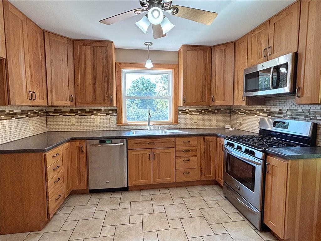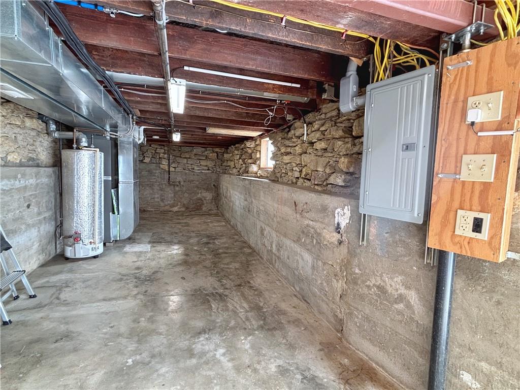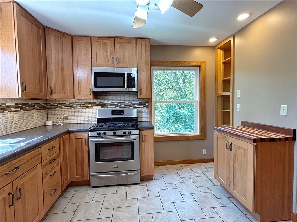 Welcome to this wonderfully updated and irresistibly cute 2-bedroom, 1-bath home nestled on a rare and secluded 2.63-acre partially wooded lot in the heart of Kansas City’s historic Maple Hill neighborhood. Built in 1910, this home seamlessly blends historic charm with modern upgrades. It's a perfect opportunity for those looking for a peaceful retreat with city convenience. Step inside to find a beautifully renovated interior featuring ash hardwood flooring and porcelain tile and a well-designed kitchen and bathroom with hickory cabinets and updated fixtures. The open living space spans 864 square feet on the main level, with large south-facing windows that bring in abundant natural light and views of the serene, tree-filled surroundings. Enjoy peace of mind with major system upgrades throughout, including plumbing: fixtures, supply lines, waste, vent, and exterior sewer line to main. Newer 200-amp electrical service with updated wiring, fixtures, ceiling fans and devices. Updated HVAC system: furnace, heat pump, and ductwork. Upgraded solid-core doors, windows, and no-maintenance IPE front porch deck with updated framing and piers. Wood plank tongue and groove ceiling in living/dining room. The walk-out basement offers excellent potential for a workshop, storage, or extra space and features a large sliding glass door that opens to the expansive yard, complete with mature trees, open green space, and even a creek! Easy access to I-635, I-35, Metcalf, KU Med, Johnson County, and downtown KC. This home is a true nature lover’s dream right in the middle of KCK!