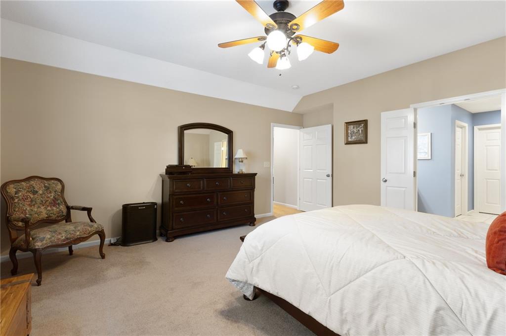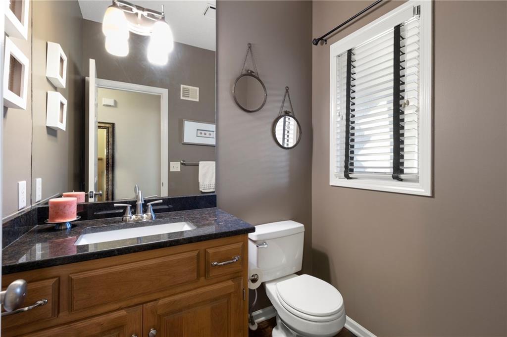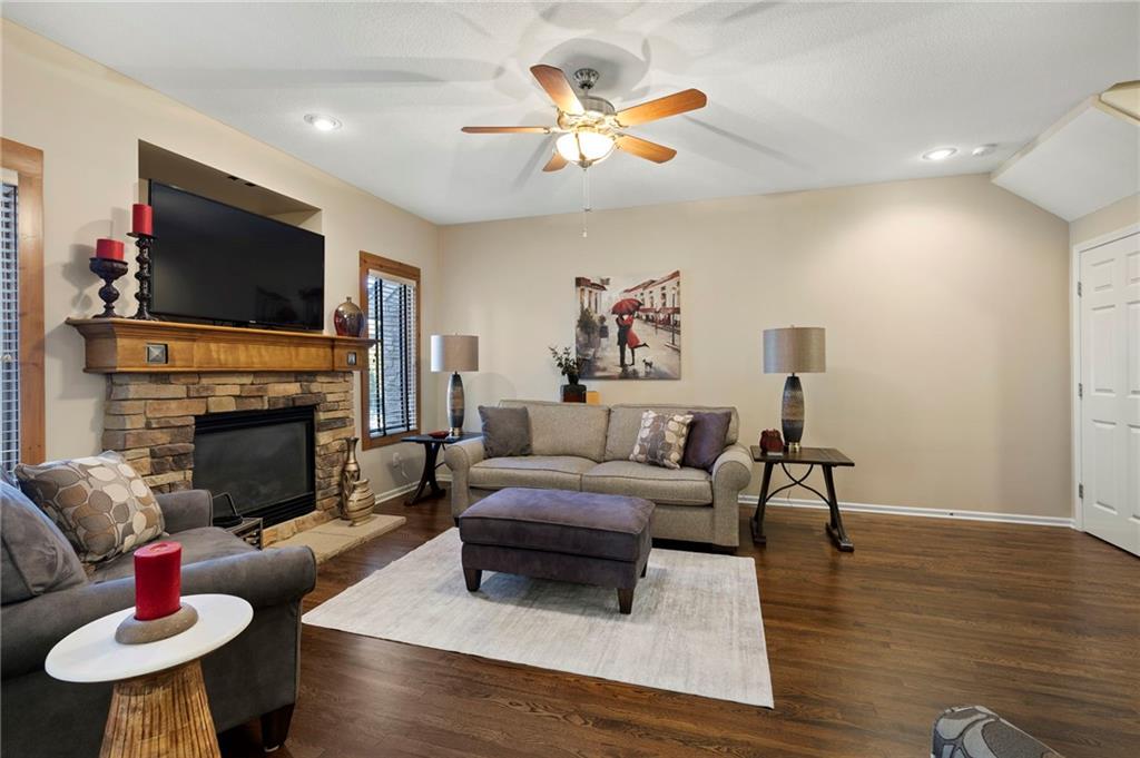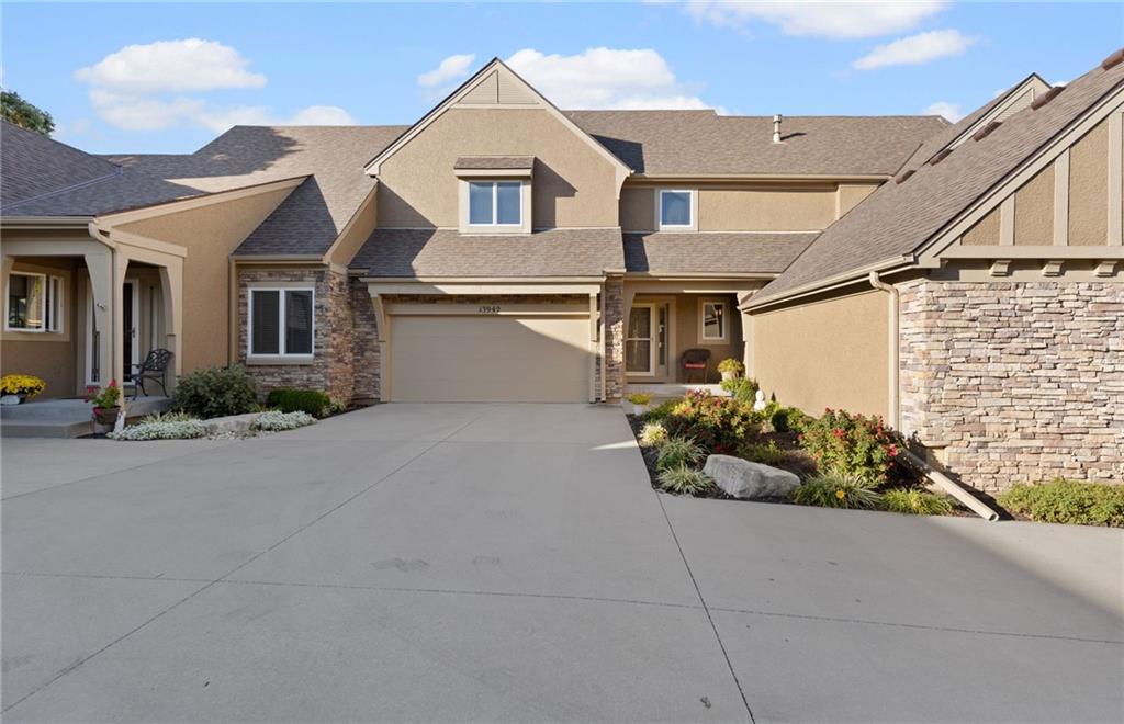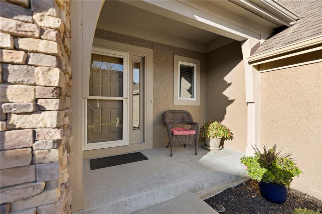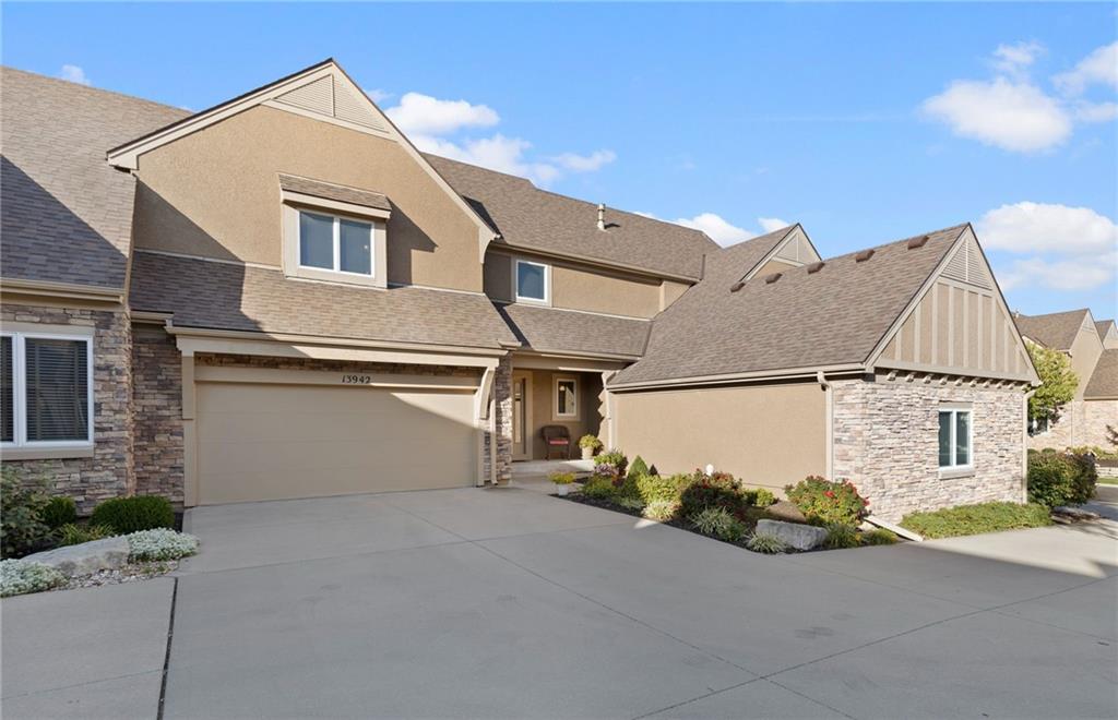 Maintenance provided living at its best in this stunning Tom French–designed Winston plan townhome, perfectly located in the highly sought-after Villages of Quail Park. This gorgeous neighborhood is known for its lush, manicured landscaping and inviting curb appeal, and this home is tucked onto a quiet cul-de-sac with a shared driveway, creating both privacy and charm. The ledge stone and stucco exterior welcome you to a covered front porch and storm door entry. Inside, gleaming hardwood floors set the tone, flowing past a stately half bath with granite vanity and into the spacious great room. Centered by a stone fireplace flanked by large windows, the great room creates a warm and inviting space that seamlessly connects to the breakfast area. From here, step through French doors to the screened-in deck with access to a flagstone patio and small yard—an ideal spot for morning coffee or evening relaxation. The kitchen offers a granite breakfast peninsula, stainless steel appliances, and two access points to the laundry room, one leading directly to from the kitchen and the other from the main entry hallway. Upstairs, a versatile loft/office area provides additional living space, perfect for working from home or relaxing with a book. The owner’s suite is a true retreat with plush carpet, ceiling fan, and French doors that open to a spa-like en suite bath featuring a jetted tub with tile surround, separate shower with ledge, double granite vanity, and large walk-in closet. Two additional bedrooms, each with ceiling fans, blinds, and soft carpet, share a hall bath with tile flooring, an extended granite vanity, and shower. The daylight, unfinished lower level is stubbed for a bath and offers excellent storage now with the opportunity to expand living space in the future. Blue Valley Schools add to the value of this thoughtfully designed home in a community where comfort, convenience, and timeless style come together.