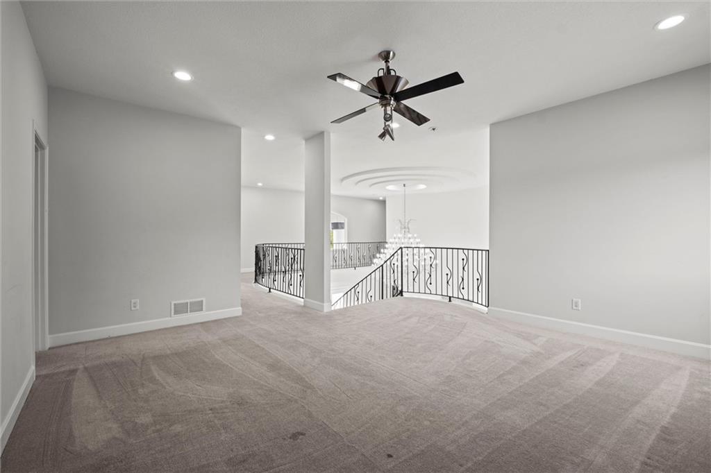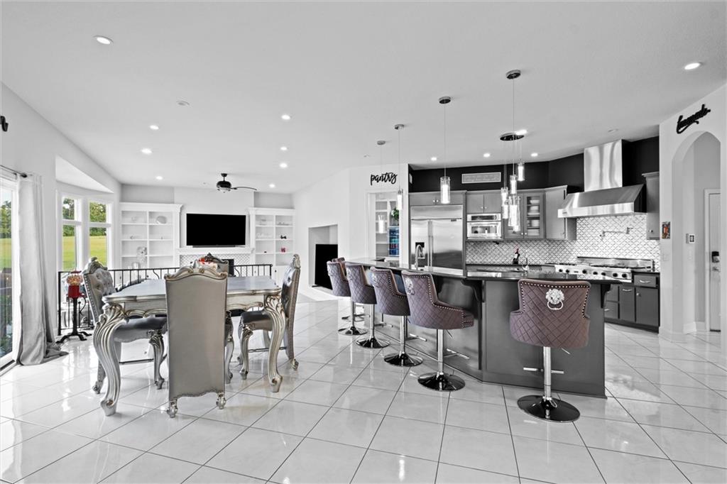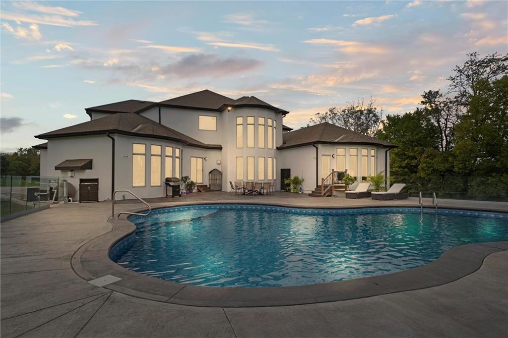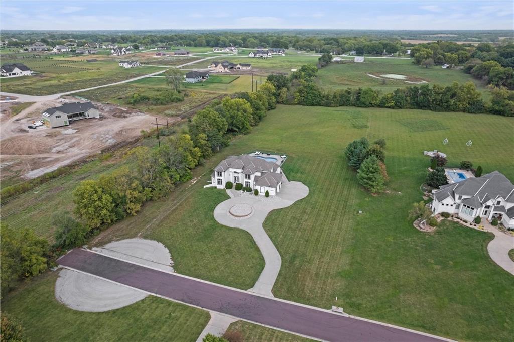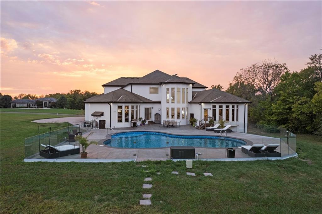 Stunning luxury estate on 4 acres in the coveted Wildflower Subdivision! Centrally located in highly desired Lee's Summit, featuring top-rated schools, and bordering the communities Legacy Park Complex where you will find 692-acres with softball, baseball, football and soccer complexes. The park also includes 3 shelters, Lovell Community Center, a 22-acre lake with fishing dock, disc golf course, amphitheater, playground, and a 4.7-mile trail. -- This home offers 5 bedrooms plus a 6th & 7th nonconforming in basement, a dedicated office on main level, 4 full and 3 half baths, and oversized 4-car garages. Soaring 20' entry ceiling & 22' formal living ceilings with floor-to-ceiling windows and a see-through fireplace into the chef's kitchen, which features a top of the line Viking Refrigerator, 6-burner gas stove, Dual Islands with Prep Sink, 2 dishwashers, Pot Filler, Granite Counters, and a large walk-in pantry with built-in counter space. The oversized primary suite includes direct access to the pool, a see-through fireplace into the spa-like bath with whirlpool tub, dual vanities, dual-head shower, and a huge 3-tier walk-in closet with private laundry. Upstairs features a large loft, walk-in closets in every room, and a second laundry. The newly finished walkout basement was just finished in 2025 w/ upgraded tile throughout and offers true multigenerational living potential with its own 4th car garage, full kitchen with New SS appliances and walk-in pantry, 3rd laundry area, 3 living room/recreational areas, theatre room, 3 bedrooms (2 non-confirming), 3 bathrooms, and a walkout to the side yard. The backyard is an entertainer's dream w/ a nearly new heated vinyl pool, new stamped concrete patio, & glass fencing, plus tons of open backyard space for recreational sports. Additional features include a Reolink hardwired security system w/ 16 cameras, oversized deep garage bays, a beautiful circle driveway, & abundant storage. Upgraded lighting and plumbing throughout.