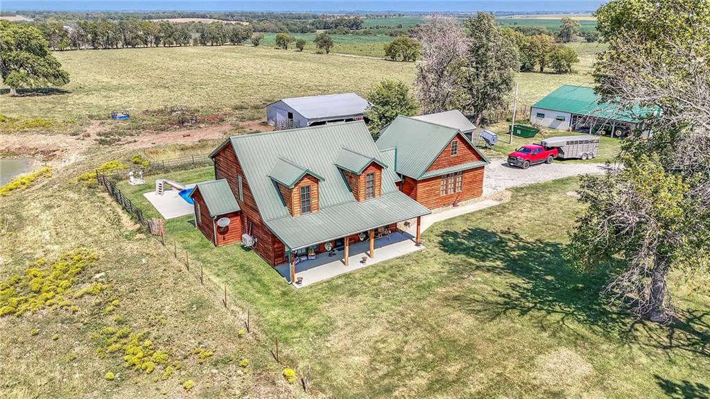 Escape to your own private retreat located on 40 acres, directly off of a paved road. This charming cedar-sided home offers a classic, timeless aesthetic with natural warmth and character, combining the best of country living with a move-in-ready home. Imagine waking up to wonderful views in every direction and ending the day on a spacious 30'x10' covered front porch, enjoying the quiet sitting on your expansive land. This is the perfect setting for those seeking tranquility, privacy, or those who love the great outdoors, whether for farming, equestrian pursuits, or simply relaxing by a bonfire under the stars. Offering 3 bedrooms and 3 bathrooms, wood floors, loft area, unfinished separate office/craft room above the garage, and a 3'-8.5' deep in ground saltwater pool for relaxation! This home has zoned HVAC and a pellet stove for aux heat. Multiple outbuildings offer ample storage and workshop potential, with a 28' x 52' insulated outbuilding which has 220V, 200-amp service, concrete floor, (2) 12'w 10'h doors, and a 10' lean-to as well as four other outbuildings which are 40'x40', 20'x30', 16'x30', & 34'x34'. Acreage is fenced, there is a pipe corral and pipe gates, water is available between ponds and there is water to the outbuildings. The office/craft room is an unfinished room above garage currently used for storage but could easily be finished into livable space. All kitchen appliances stay with the home.