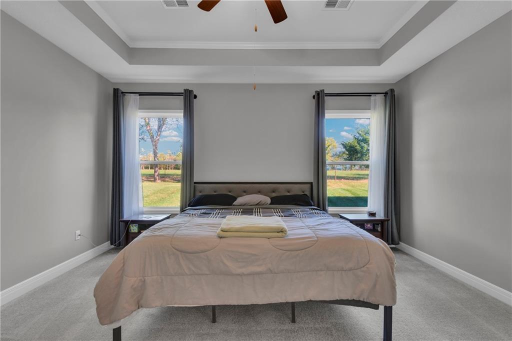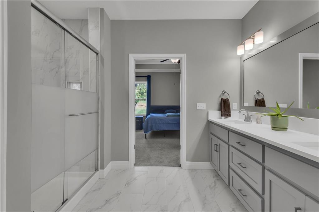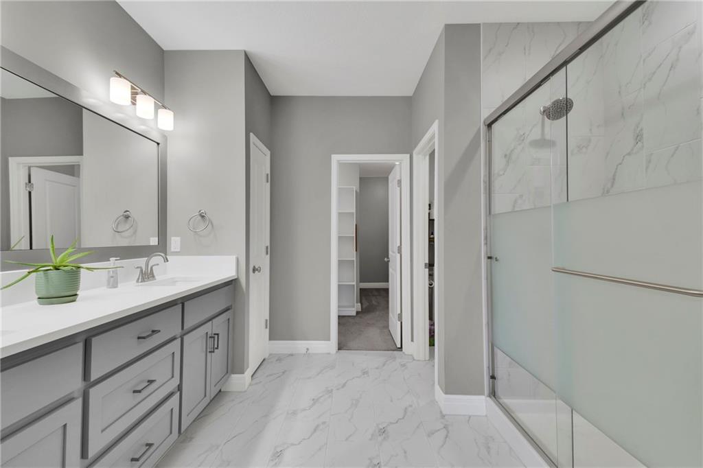 Nearly “New” built home, ready for you. Welcome to Aster, a beautiful ranch-style home by Authentic Homes KC! This thoughtfully designed home is packed with luxurious upgrades and stylish touches throughout. Gorgeous & upgraded flooring offers both elegance and durability. This open-concept layout features a chef-inspired kitchen with quartz countertops, stainless steel appliances including a gas stove, custom cabinetry, a walk-in pantry, ample counter space, and a large center island that flows seamlessly into the spacious living room—perfect for entertaining. The master suite boasts a large bedroom, a spa-inspired bathroom with double vanity, custom tiled shower with bench seat, and a generous walk-in closet conveniently connected to the laundry room. Step outside to enjoy the expansive covered patio, large back patio, and beautifully manicured yard—ideal for relaxing or hosting gatherings. This home is move-in ready and easy to show—don’t miss your chance to make it yours!