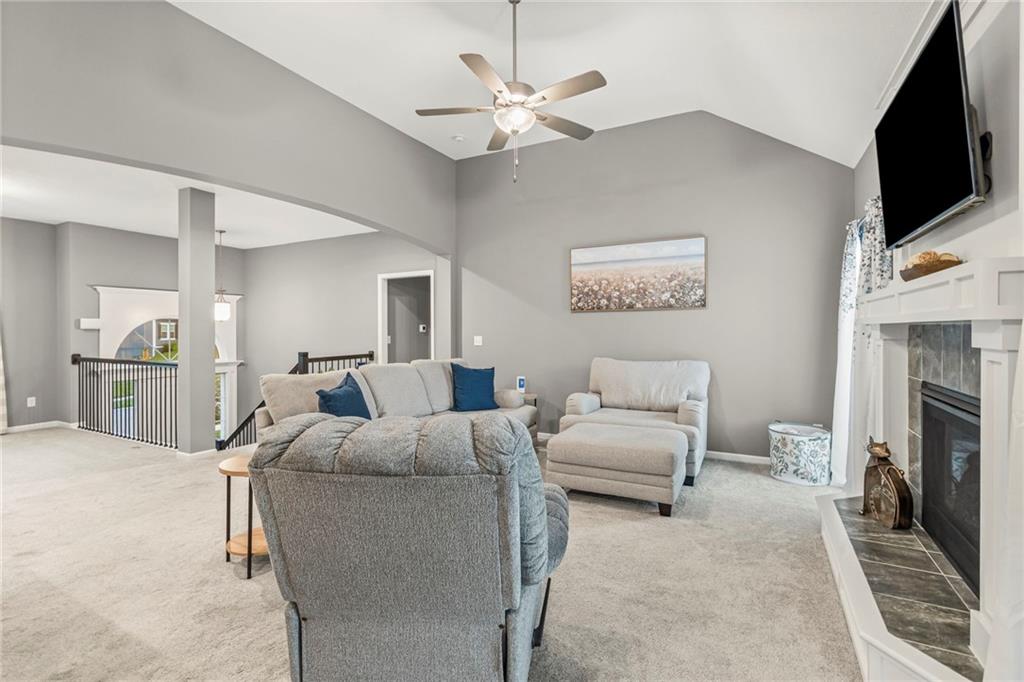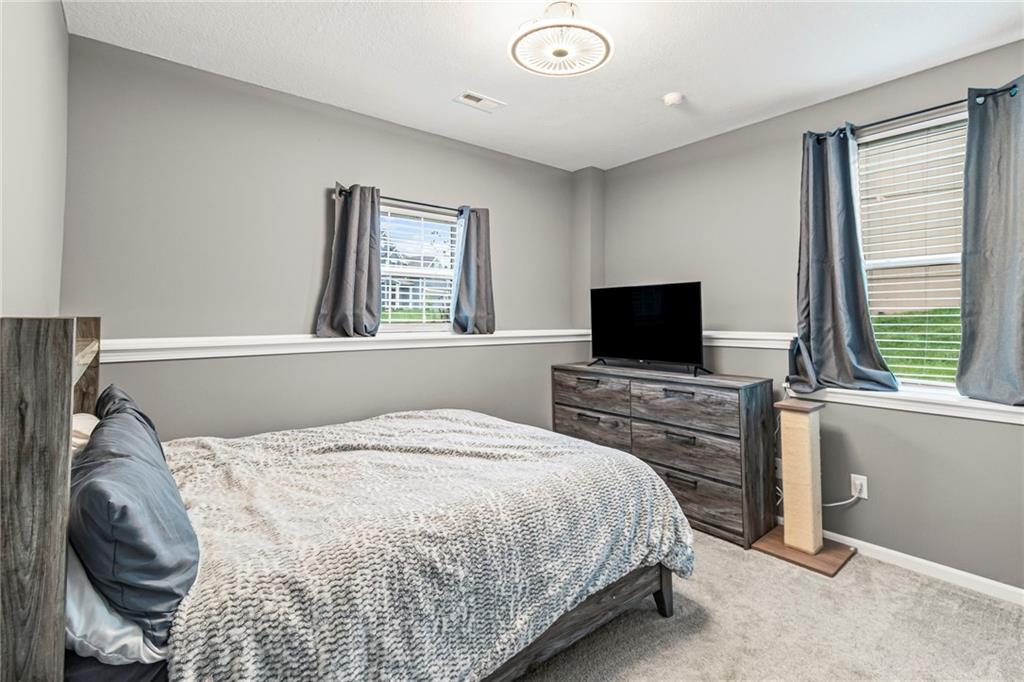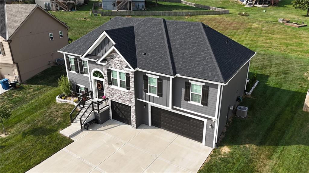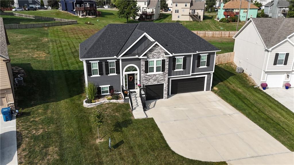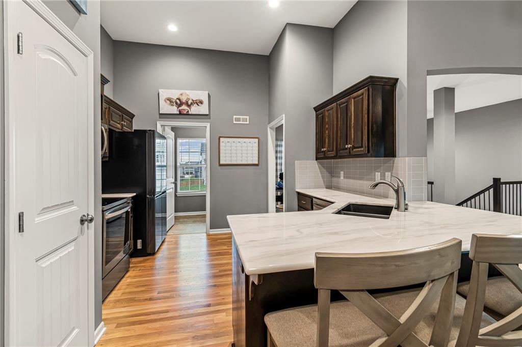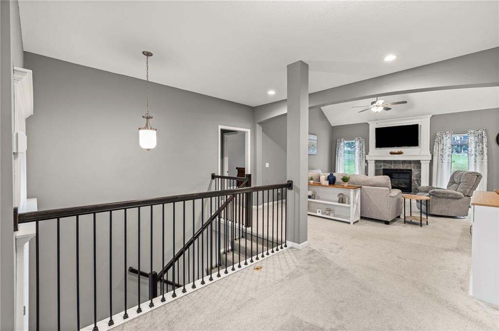 Step inside this nearly new Liberty home where thoughtful design and everyday comfort come together. The main level greets you with a spacious, light-filled living room anchored by a cozy gas fireplace and plush carpet that invites you to kick off your shoes and stay awhile. Just beyond, warm hardwood floors carry through the kitchen and dining area—an open, seamless space perfect for gatherings. The kitchen shines with quartz countertops, stainless steel appliances, ample cabinetry, and a pantry, while the conveniently located laundry room just off the kitchen keeps everything practical and within reach. The primary suite is privately tucked away, offering a peaceful retreat with a large walk-in closet and a spa-inspired bath complete with dual sinks, soaking tub, and separate shower. Two additional bedrooms and a full bath round out the main level. Downstairs, the finished lower level expands your living space with a generous family room ideal for movie nights, game days, or a cozy hangout spot. You’ll also find a fourth bedroom and third full bath—perfect for guests or a home office. Out back, unwind on the covered deck or entertain on the extended patio overlooking the beautifully maintained yard. With an oversized three-car garage and access to Clay Meadows’ neighborhood pool, this home blends small-town Liberty charm with modern style and convenience.