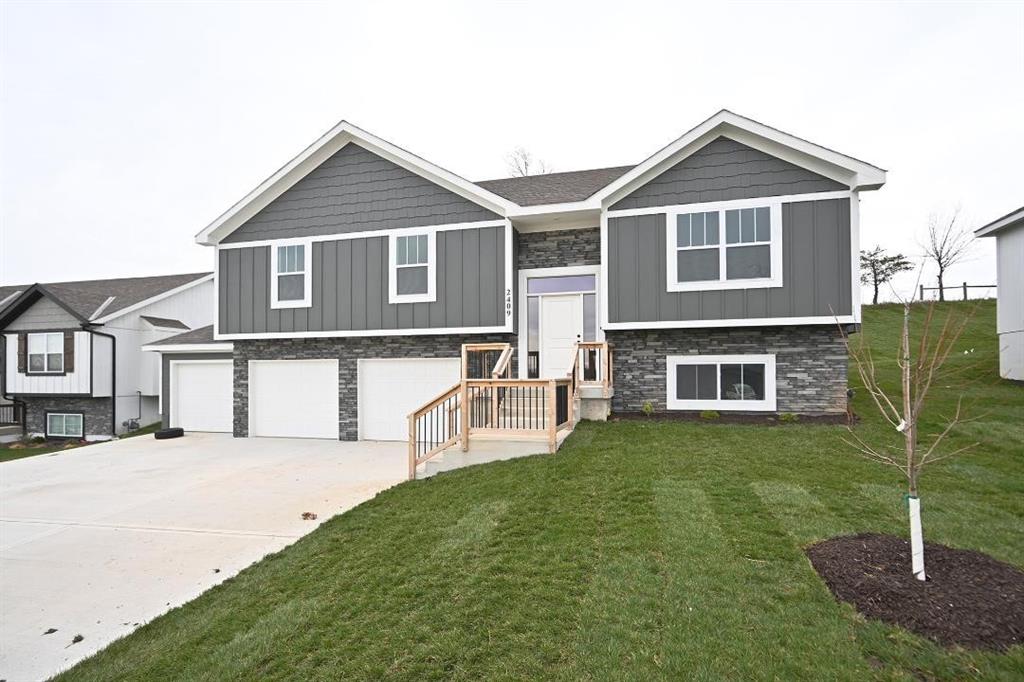 Stunning Custom Home with Modern Features and Inviting Spaces Welcome to your dream home! This exquisite property showcases an open floor plan, ideal for both entertaining and everyday living. The elegant kitchen boasts pristine white granite countertops, custom cabinets, and stainless steel appliances, all seamlessly flowing into the spacious living area centered around a beautiful fireplace. Step outside to discover a covered deck complete with a fan and light, perfect for enjoying serene views of the adjacent pasture. The rich feel of this home is accentuated by LVP throughout and vaulted ceilings enhancing the sense of space and light. The laundry room features stylish tile, while two generously-sized guest bedrooms offer plush carpeting, ceiling fans, and trey ceilings, creating a comfortable retreat for family and friends. The guest bath is tastefully designed, highlighting a tiled tub and a marble vanity that exudes luxury. Retreat to the master bedroom, a good-sized haven with carpet, a ceiling fan, and sophisticated trey ceilings. The walk-in master closet provides ample storage, while the en-suite master bath features elegant tile flooring, a double vanity with sleek black faucets, and a spacious tiled shower. The lower level invites you to enjoy a large fourth bedroom, complete with carpeting and a ceiling fan, alongside a substantial family room perfect for movie nights. The additional full bath boasts a tiled floor and a shower for convenience. Completing this remarkable home is an oversized three-car garage, providing plenty of space for vehicles and storage. The front of the house is adorned with beautiful stone, adding to the curb appeal with shutters to boost the look. Don’t miss the opportunity to make this luxurious yet inviting home your own! SIMULATED PHOTO'S NEW ONES COMING SOON - THE POND IS STOCKED FOR FISHING