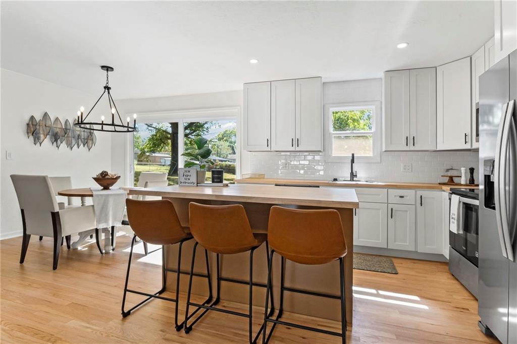 MOVE-IN READY, CHARMING RANCH IN RAYTOWN! Welcome home to this delightful 3 bedroom, 2.5 bath ranch nestled on a spacious lot in Raytown. This home offers a beautiful, open and functional layout, warm finishes and a finished basement to expand your living options. Step inside to discover refinished hardwood floors and fresh paint throughout. Sunlit living room flows into a NEW kitchen, equipped with ample cabinetry, island, butcher block countertops, stainless steel appliances and modern fixtures. Adjacent dining area is perfect for entertaining. Primary suite features a private half bath! Two additional bedrooms and full bath are beautifully appointed. Downstairs, the finished lower level includes family room, rec area, office/flex space or non-conforming 4th bedroom, 2nd full bath and laundry area. Outside, enjoy a spacious yard—perfect for entertaining or relaxing—complete with concrete patio. One-car attached garage adds convenience and extra storage. This home is ideally located near shopping, schools, and major routes for easy access to Kansas City and surrounding amenities. Don’t miss this rare opportunity to own a turnkey ranch in Raytown! WELCOME HOME!