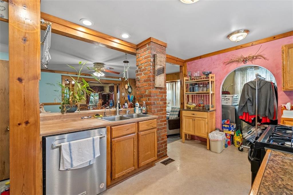 Welcome to this charming 110-year-old home, a timeless treasure that blends historic character with cozy modern comforts. Nestled in a welcoming neighborhood, this delightful property at 446 N. 16th St. in Kansas City, KS offers 3 bedrooms and 1 bathroom, making it an ideal haven for families, first-time buyers, or anyone seeking a warm and inviting space to call their own. With its rich history and thoughtful details, this home invites you to step into a piece of the past while enjoying the practicalities of today. Step inside, and you’ll be greeted by a warm, open living area that seamlessly flows into a spacious dining room. The interior boasts rich wooden beams and trim that highlight the home’s historic roots. Large windows flood the space with natural light, offering views of the lush backyard and creating a bright, airy atmosphere. The kitchen is the heart of this home, blending vintage appeal with functional design. Wooden cabinetry, crafted with care, provides ample storage, while a central island houses a modern stove and oven, ideal for preparing home-cooked meals. A sliding glass door opens to the backyard, seamlessly connecting indoor and outdoor living. The adjacent laundry area, tucked neatly into the kitchen layout, adds convenience with its practical setup. The home also includes a water filtration system, continental polymer siding with a 50 year transferable warranty, and leaf filter gutter covers with a lifetime transferable warranty against clogging. The backyard space is framed by mature trees, offering shade and a natural backdrop, with a small patio area perfect for outdoor entertaining. The presence of gardening tools suggests potential for further landscaping, allowing you to put your personal stamp on this lovely outdoor retreat. This home is filled with character, ready to welcome new memories. Don’t miss the opportunity to own this piece of history with all the comforts of modern living!