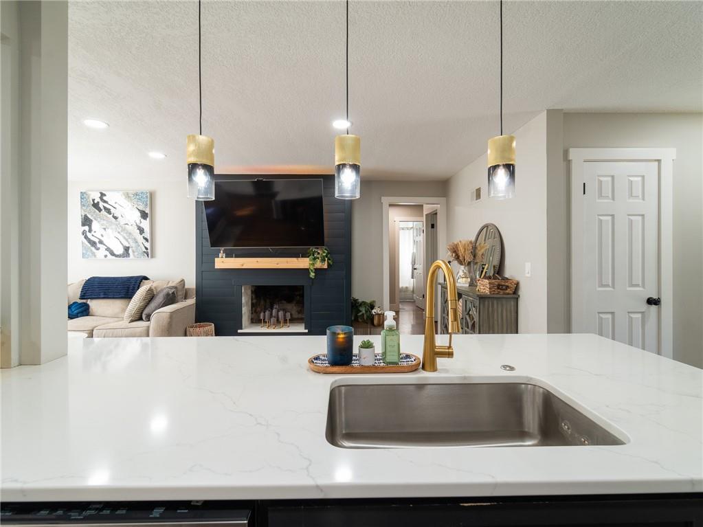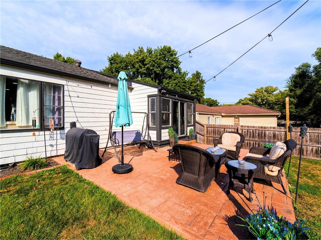 QUICK POSSESSION AVAILABLE! Completely remodeled in 2023, this 3-bedroom, 2-bath home combines modern design with comfortable living. The open layout features hardwood floors, a custom fireplace, and a beautiful kitchen with new cabinets, upgraded appliances, and a wet bar with a wine cooler, beverage fridge, and extra storage. The remodeled sunroom offers a bright, inviting space for entertaining or relaxing. Outside, a large textured concrete patio with bistro lights and a privacy fence sets the scene for evenings spent with friends or quiet mornings with coffee. The unfinished basement adds potential for expansion and value-add in the future. Protected by a newly installed security system, every detail has been carefully updated to create a home that feels fresh, stylish, and modern.