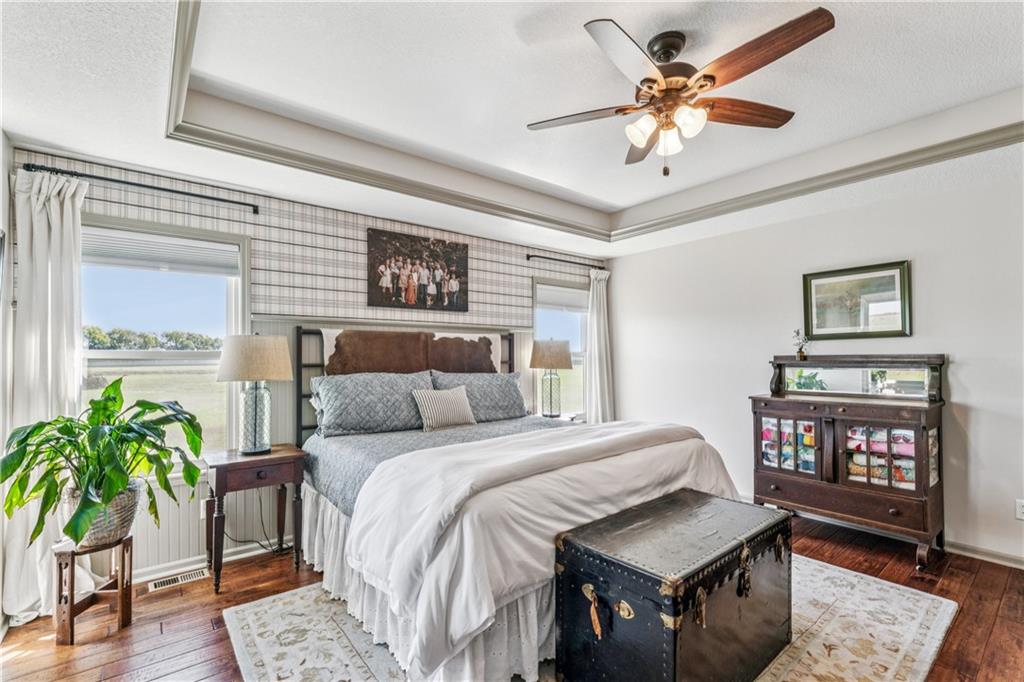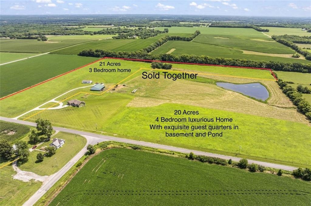 TWO HOMES on a 41.41 ACRES luxurious property. Can be used as a single family, multigenerational, investment and/or income producing. These combined properties offer luxury and versatility over this picturesque land, with it's gorgeous serene pond, a 40X60 barn with lean-to & tack room, Creating the perfect blend of elegance, function, and income-producing potential. *MAIN RESIDENCE is a showcase of craftsmanship and comfort — warm wood floors, a cozy fireplace, and a chef-inspired kitchen designed for entertaining with 3 Bedrooms and a 4th non conformant. Enjoy watching sunsets under the covered front porch or sip coffee on the outside balcony watching the sunrises, taking in sweeping views of open fields. The primary suite and its spa-like luxury bathroom with radiant heated floors, a double vanity and large walk-in shower, large spacious custom closet, make it a relaxing place to escape after a long day.*FULLY FINISHED LOWER LEVEL adds flexibility from watching your favorite TV shows in comfort, along with Tons of storage and storm shelter to go to and a 2nd living space is also included with a fully equipped kitchen, living rm, bedroom, full bathroom, and walk in closet — ideal for guests, extended family, or a private rental suite. *The SECOND PROPERTY includes a beautiful 3-bedroom, 2-bath manufactured residence & extends endless possibilities for multi-generational living, guest accommodations, or passive rental income, whether it be in rent or even the notorious AirBnB, a 2nd full property is definitely an asset. *THE PROPERTY'S NATURAL BEAUTY and thoughtful design, create a sense of retreat & freedom. Whether you’re watching sunsets over the pond, hosting family gatherings, or managing livestock in the barn, this estate offers the space and serenity. *PERFECTLY LOCATED 15 min from Harrisonville & Louisburg, and only 45 min from downtown KC, this property delivers privacy and convenience