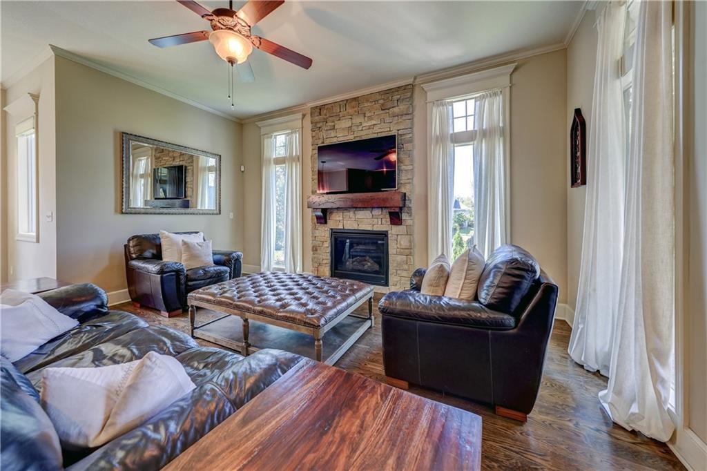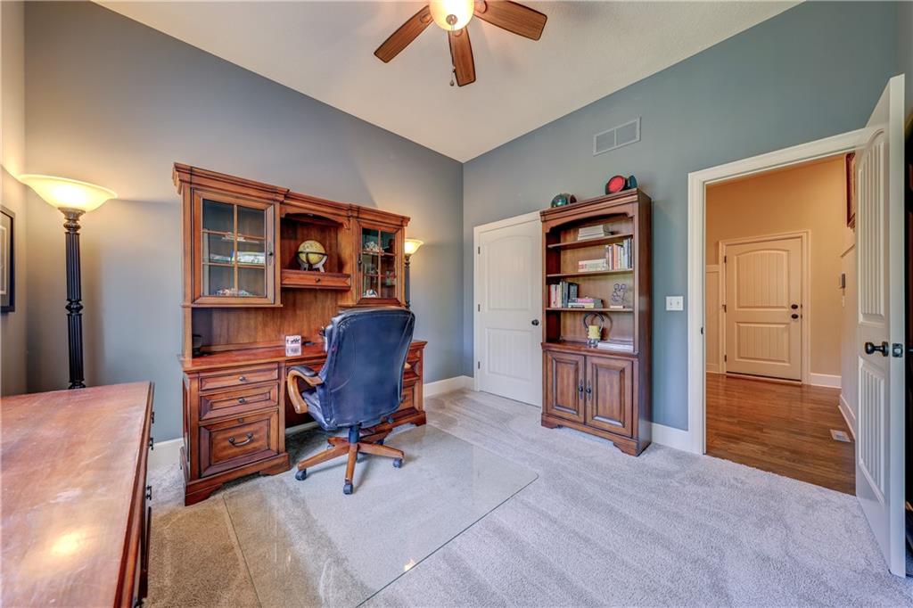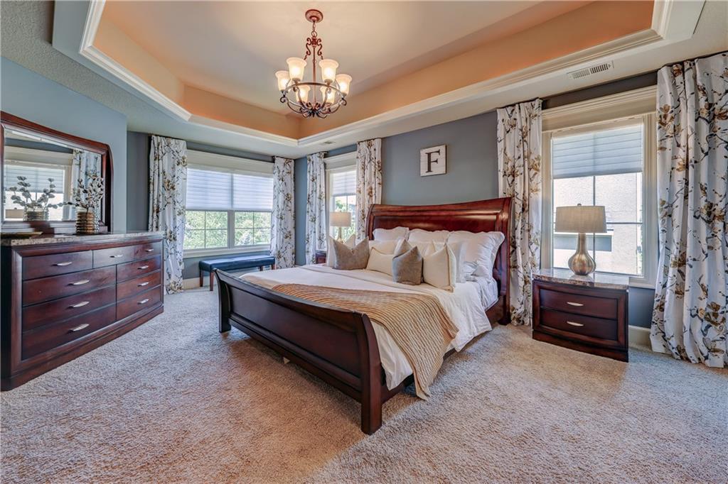 Great opportunity to live in Mills Farm within the top-rated Blue Valley school district. This 5-bedroom/5-bath two-story was quality built by Estes Homes and it shows in the trim work and details throughout. An impressive two-story foyer sets the tone, flanked by a vaulted dining room with wood beams and a first floor office/flex/bedroom next to a ¾ bath. The kitchen checks every box: large walk-in pantry, butler’s pantry with beverage fridge, large island, 5-burner gas cooktop, and front/back staircases for easy flow. Professionally refinished hardwoods on most of first floor and brand-new upgraded carpet (except the flex room). Full stucco exterior with newer paint. Outdoors is built for everyday living: a large covered deck with low-maintenance composite decking, outdoor fireplace with TV hook-up, a generous stamped patio, and a black metal fence. Three total fireplaces add warmth inside and out. The daylight lower level brings in natural light through seven windows and is ready to finish for additional living space. Roof is less than a year old. Enjoy the Mills Farm lifestyle, full of amenities, including: three pools, remodeled clubhouse with workout room, play area, pickleball, tennis courts and sand volleyball!