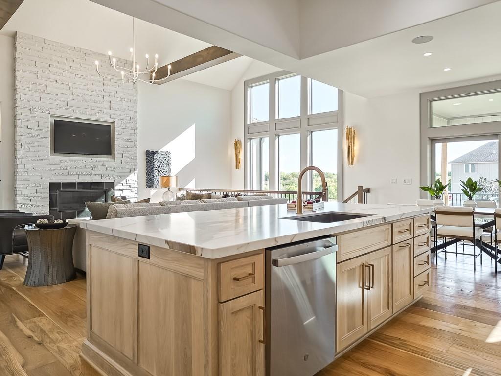 Expected Spring 2026 completion, welcome to the gold award-winning Brookridge IV by the esteemed Don Julian Builders. Located on a quiet cul-de-sac on lot 19, backing to green space with a dramatic view to the horizon, this reverse 1.5-story plan in Bristol Highlands Estates blends luxury with livability. Enter through double doors into a dramatic foyer and great room with 2-story windows, vaulted wood-beamed ceiling, and a striking stone fireplace to impress from the moment you step inside. The kitchen shines with an oversized island, 5-burner gas cooktop, custom hood, vaulted ceiling with skylights, and a massive walk-in pantry with prep space and second fridge. Just off the dining area, step onto the covered deck—perfect for morning coffee or unwind in the evening with a view to the horizon. The main-level primary suite offers a spa bath with dual vanities, soaking tub, tiled shower, and a walk-in closet that connects to the laundry. Two more bedrooms, a full bath, and a powder room for guests round out the main floor. Downstairs, the finished walkout basement is built for fun with a media wall, rec room, game space, spectacular bar, plus 2 more bedrooms with private bathrooms that walks out to a patio for another outdoor entertaining space. Nestled in the rolling hills of Shawnee, Bristol Highlands offers stunning views and a peaceful setting. Enjoy top-rated De Soto schools, shopping, dining, and outdoor recreation with nearby parks, trails, Shawnee Mission Park, and multiple golf courses. It’s the perfect balance of convenience and natural beauty. Photos and virtual tour are of a similar model home.