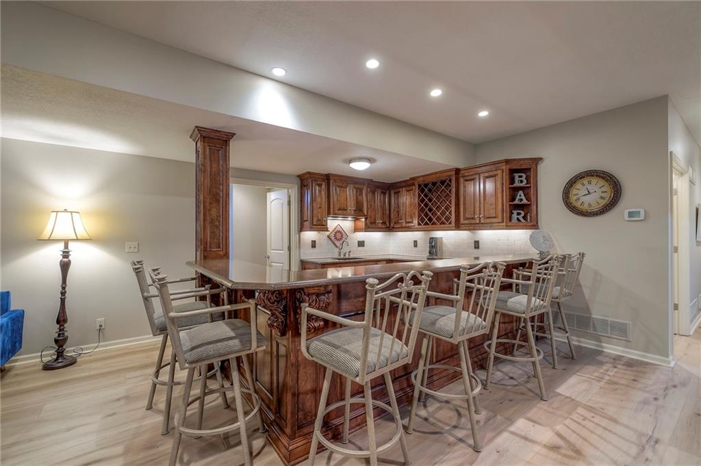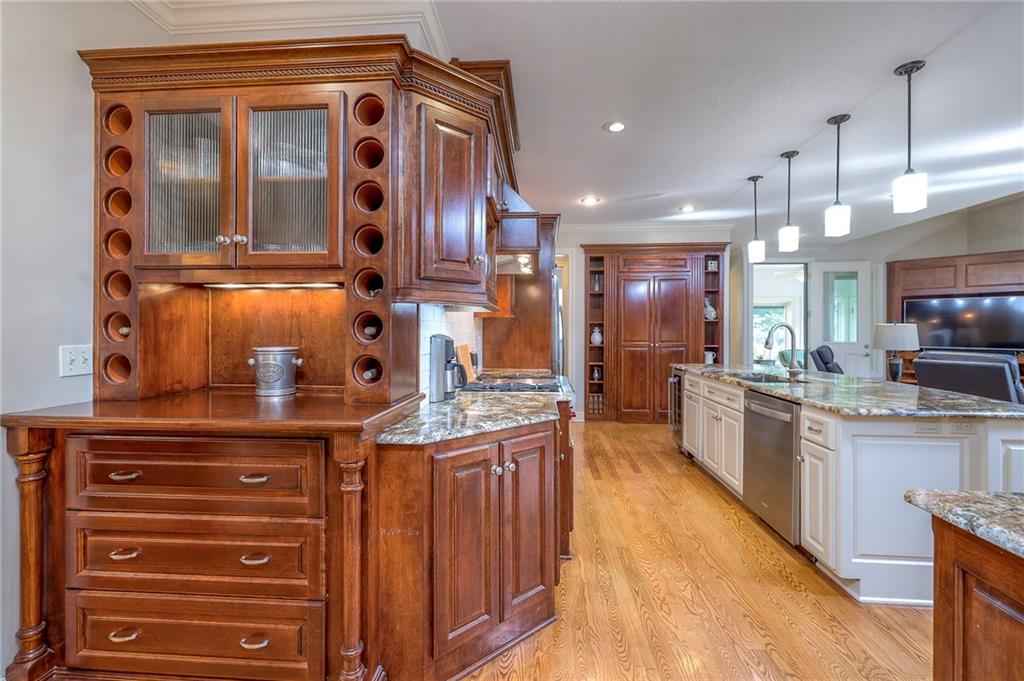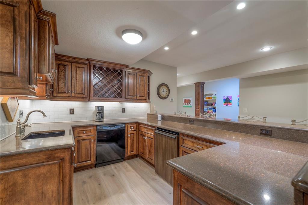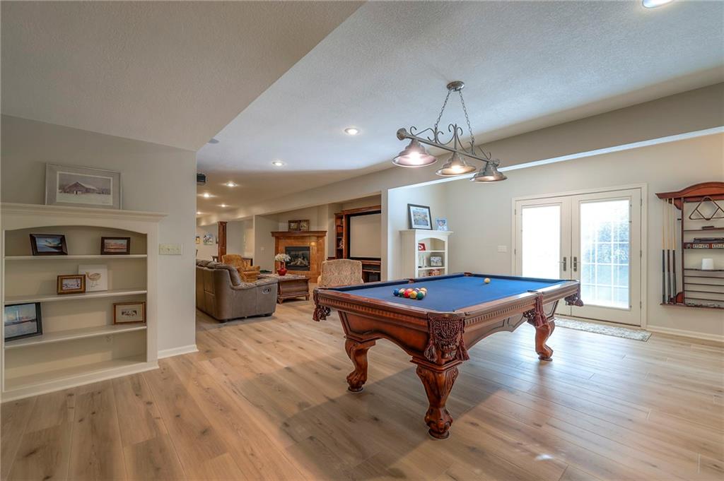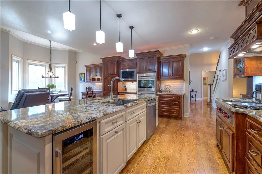 Welcome home to this stunning custom-built 1.5-story residence offering over 6,400 sq. ft. of beautifully designed living space in one of Overland Park’s most desirable neighborhoods. Step through the grand double-door entry into a welcoming foyer that sets the tone for what’s ahead. The oversized formal dining room is ideal for holiday gatherings and entertaining. The main-level living room impresses with its tall ceilings, elegant fireplace, built-in bookshelves, and incredible natural light—it’s a space you simply have to see in person. The gourmet kitchen is fabulous, featuring an oversized hearth room, a Wolf gas cooktop, a beverage fridge, a large kitchen island with seating, abundant cabinetry, and ample counter space—perfect for everyday living or hosting friends and family. The laundry room is conveniently located on the main level and offers plenty of extra space for functionality. The primary suite is a retreat of its own, complete with tray-vaulted ceilings, gorgeous hardwood floors, and a newly remodeled spa-like bathroom featuring a freestanding soaking tub, walk-in sauna, walk-in shower, and an expansive closet. Upstairs, you’ll find three spacious secondary bedrooms, each with fantastic closet space, plus a bonus loft area ideal for a reading nook, study space, or playroom. The finished lower level is an entertainer’s dream—boasting a large rec room with fireplace, second kitchen and bar area, room for a pool table, kids’ play area, and a dedicated exercise room. The home also features a suspended garage, providing an abundance of extra storage space, and the walk-up/walk-out design adds both light and convenience. Step outside to a fully fenced backyard featuring black metal fencing, a composite deck, and a large patio—the perfect setting for outdoor relaxation or entertaining. This home truly has it all—incredible design, comfort, and craftsmanship—and must be seen in person to be fully appreciated!