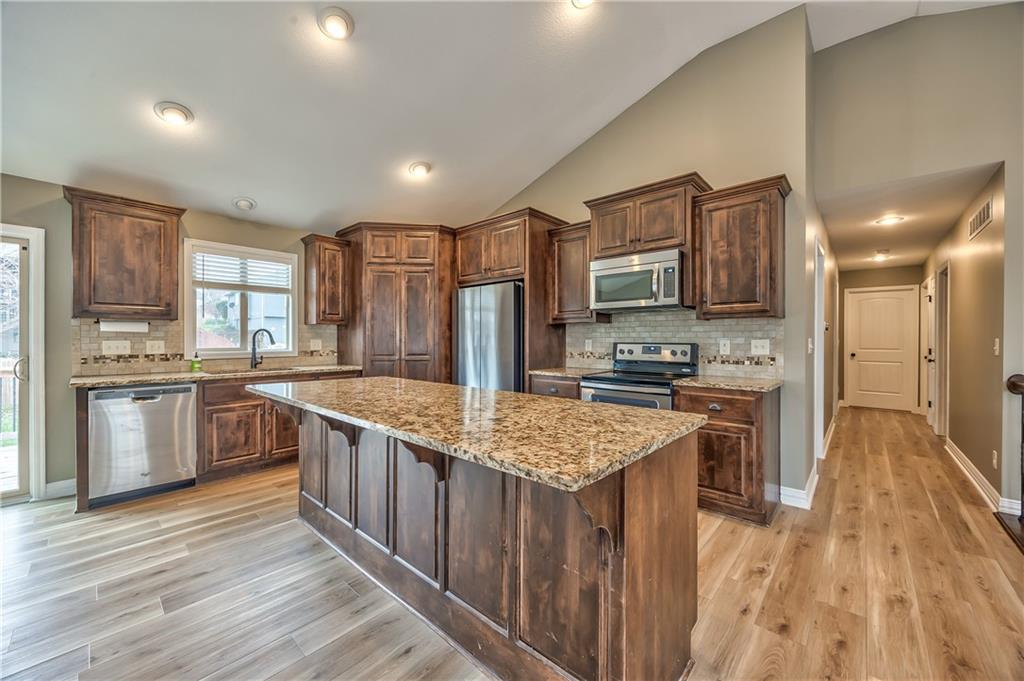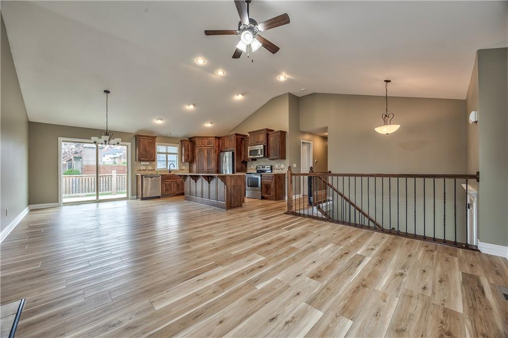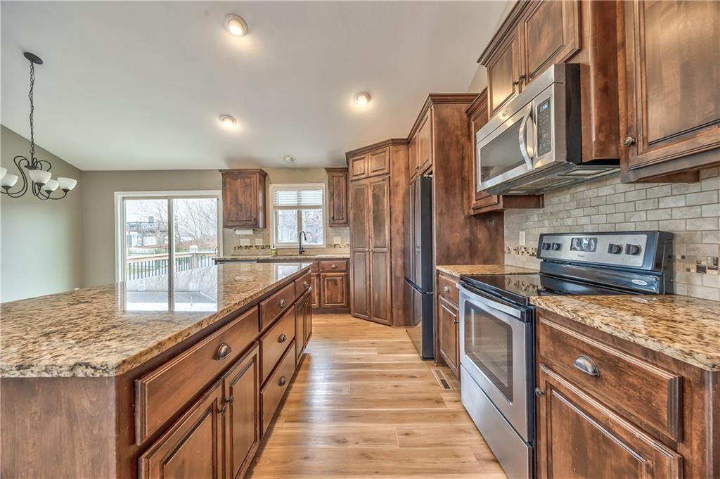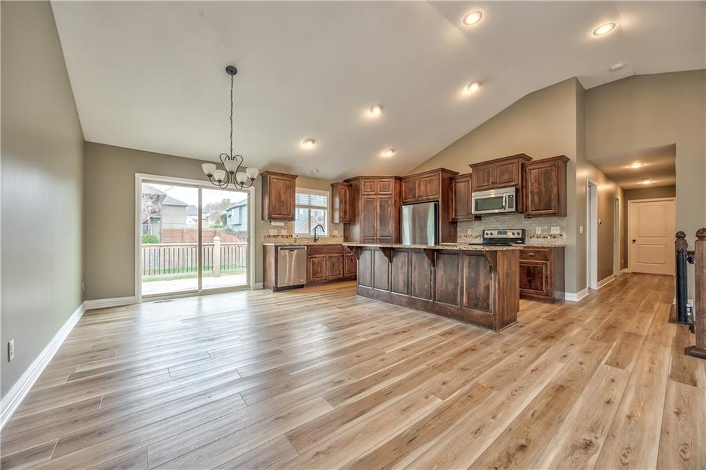 This beautiful split-entry home offers a welcoming layout with stylish updates throughout. The main level showcases luxury vinyl flooring that extends through the vaulted great room, dining area, and kitchen, creating a bright and cohesive living space. The open floor plan makes entertaining effortless, while the kitchen impresses with stained cabinetry, granite countertops, a spacious walk-in pantry, and an island with breakfast bar seating. All bedrooms and the staircase feature brand-new carpeting for a fresh, comfortable feel. Convenient main-level laundry adds to the home’s practical design. The fully finished lower level provides even more living space, including a secondary family room, recreation area, additional storage, and a half bath—perfect for guests or game nights. Step outside to a generous backyard complete with a deck, ideal for outdoor dining or relaxing in your own private space. This home blends comfort, function, and modern style—ready for you to move in and make it your own.
