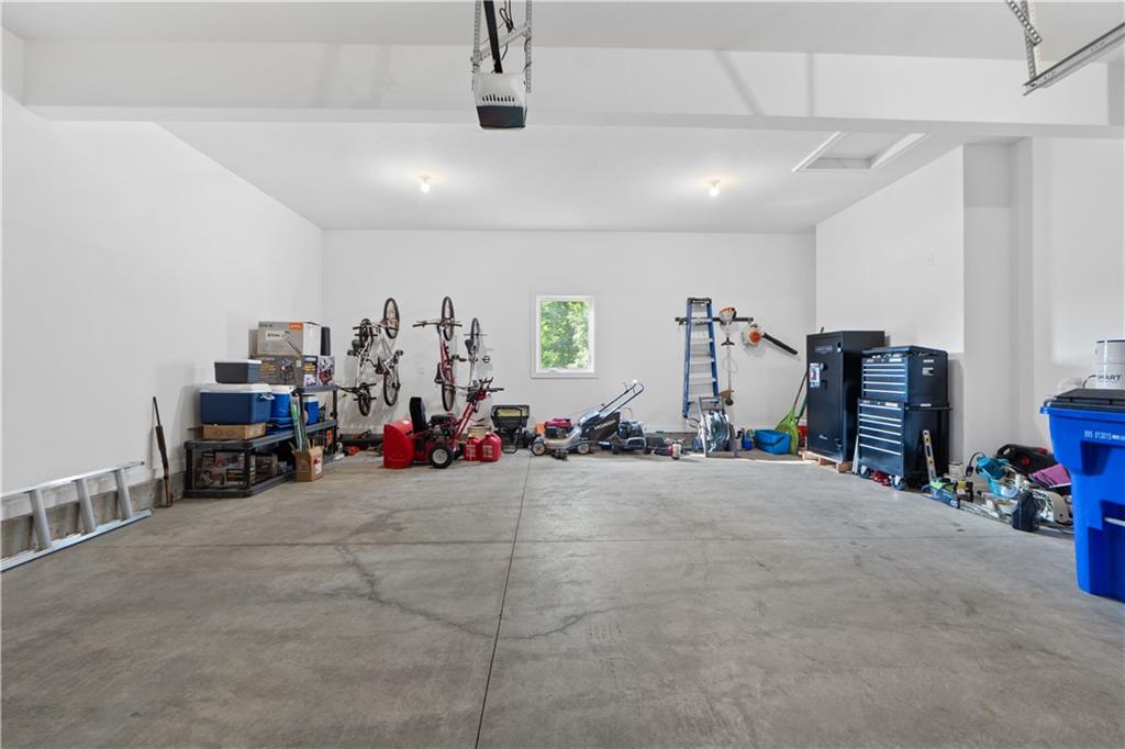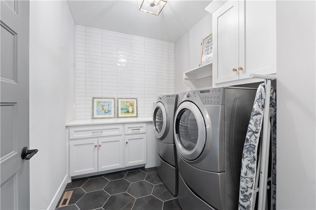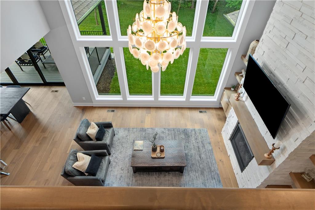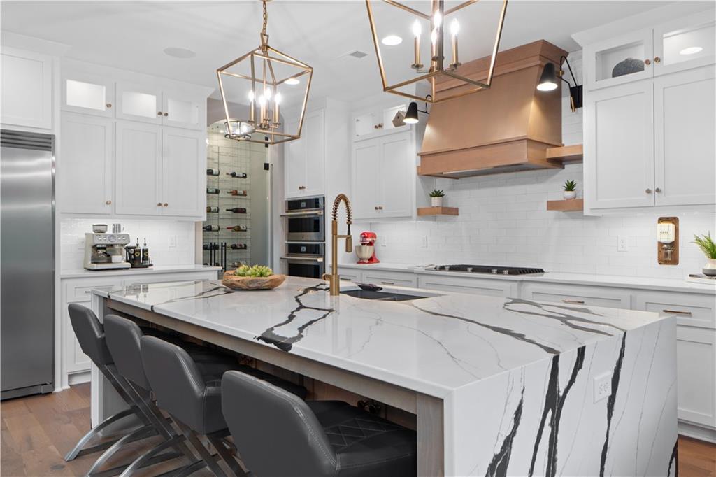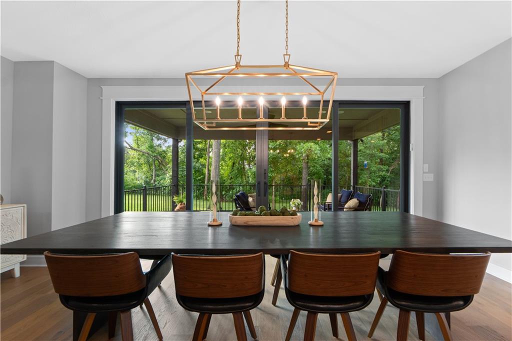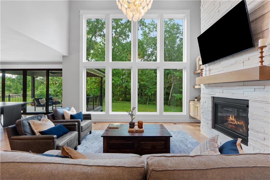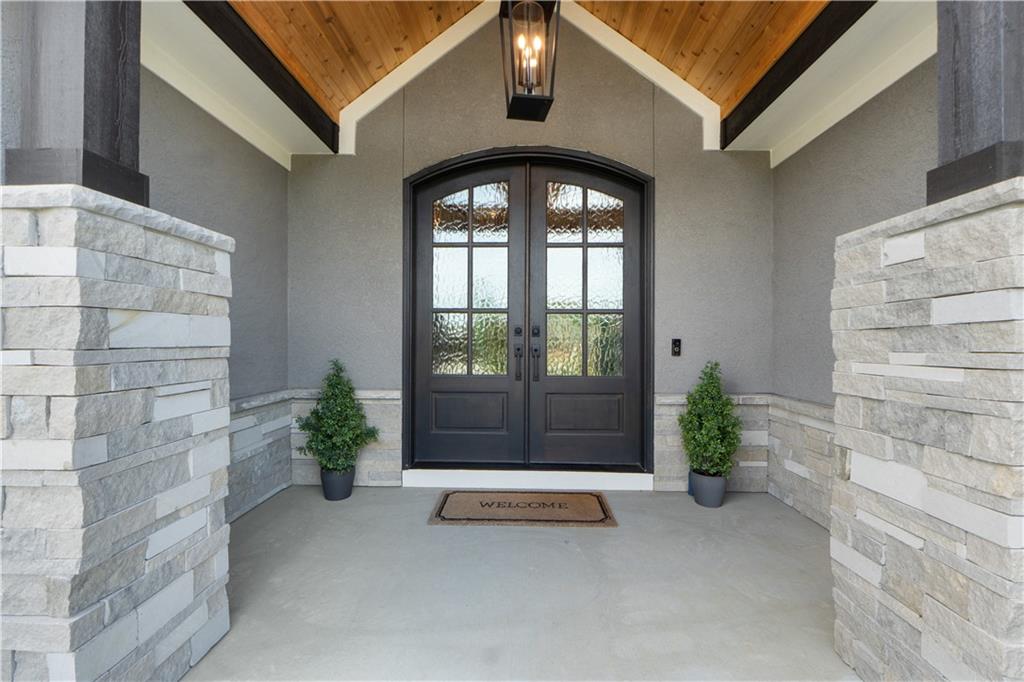 Immersed in natural elegance on .66 acre treed lot, this 5-bedroom, 4 car garage home is meticulously designed for luxury and comfort. Custom built by JFE Construction in the small private Timberstone Ridge community. Lush landscaping leads you to the cedar lined vaulted ceiling on the front porch through mahogany double doors. Inside you are greeted by a stunning curved floating staircase and 6” white oak hardwood floors flowing seamlessly across the open main level illuminated by a stunning chandelier and floor to ceiling stacked stone fireplace. The chef’s kitchen is a centerpiece: 10' waterfall island in Calcatta white & black quartz, floating shelves, custom range hood and gas cooktop. JennAir dual convection ovens (with recipes & wifi), industry-grade refrigerator and freezer. Unique glassed in Wine Cellar and walk-in pantry complete the kitchen. The dining space is perfect for large gatherings with it's ample space. Oversized double sliding doors open to bring the outside in and make the covered composite deck additional living space to relax or entertain with treed views! The home also boasts numerous SMART HOME and wifi enabled features!! Main-floor Primary Suite is a true retreat and the bathroom is spa-inspired with Calcatta Macchia Vecchia Quartz double vanities, statement pendant lights, and soaking tub. Fabulous walk-in closet includes a vanity area & extra outlets. Upstairs are 3 more bedrooms w/walk-in closets & 2 baths that maintain the high-end finishes. Daylight lower level is ready to be finished & pre-plumbed for a bathroom. A mudroom leads to the extra-deep, 4-car garages-with insulated wooden doors provide abundant space for large vehicles or gear. Outside, privacy abounds thanks to the treed yard and oversized lot, accented in front by a large retaining wall and lush landscaping. Bold black-framed windows (midnight on white) add architectural drama to the curb appeal. Walk to Cedar Niles Park/trail. Minutes from Lake Olathe!