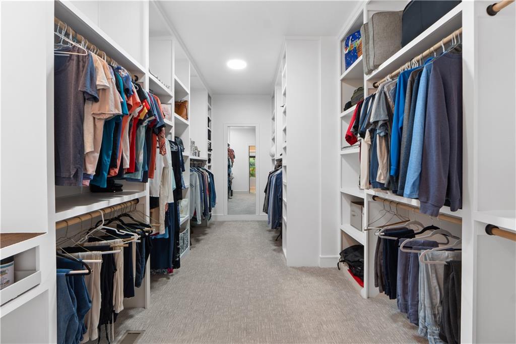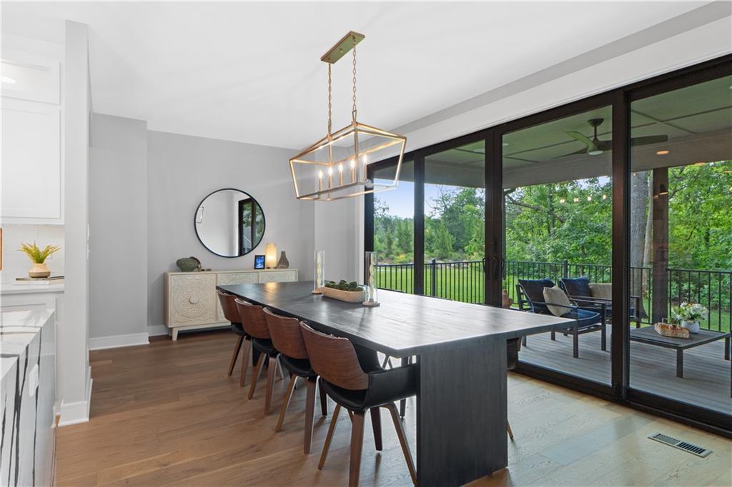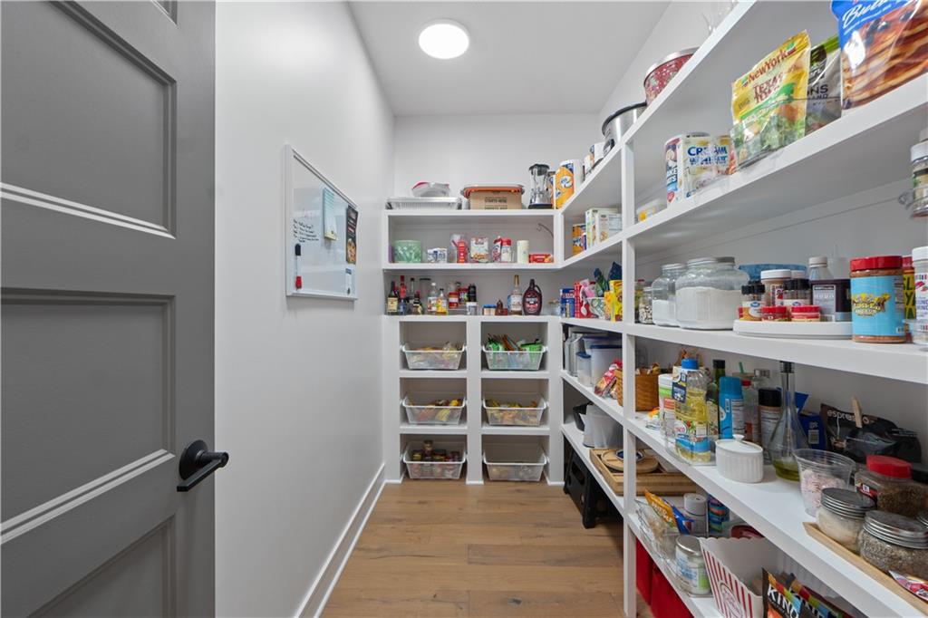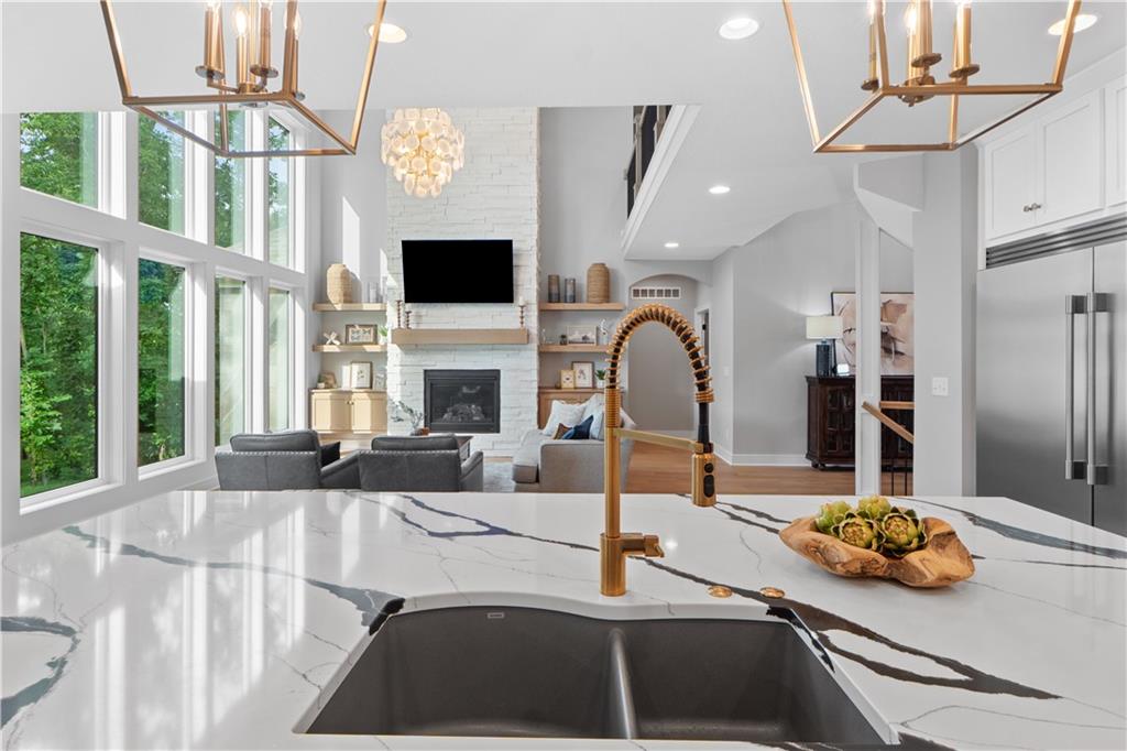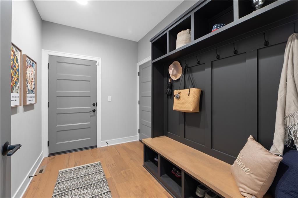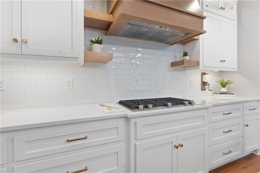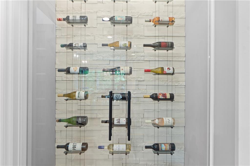 Immersed in natural elegance on .66 acre treed lot, this 5-bedroom, 4 car garage home is meticulously designed for luxury and comfort. Custom built by JFE Construction in the small private Timberstone Ridge community. Lush landscaping leads you to the cedar lined vaulted ceiling on the front porch through mahogany double doors. Inside you are greeted by a stunning curved floating staircase and 6” white oak hardwood floors flowing seamlessly across the open main level illuminated by a stunning chandelier and floor to ceiling stacked stone fireplace. The chef’s kitchen is a centerpiece: 10' waterfall island in Calcatta white & black quartz, floating shelves, custom range hood and gas cooktop. JennAir dual convection ovens (with recipes & wifi), industry-grade refrigerator and freezer. Unique glassed in Wine Cellar and walk-in pantry complete the kitchen. The dining space is perfect for large gatherings with it's ample space. Oversized double sliding doors open to bring the outside in and make the covered composite deck additional living space to relax or entertain with treed views! The home also boasts numerous SMART HOME and wifi enabled features!! Main-floor Primary Suite is a true retreat and the bathroom is spa-inspired with Calcatta Macchia Vecchia Quartz double vanities, statement pendant lights, and soaking tub. Fabulous walk-in closet includes a vanity area & extra outlets. Upstairs are 3 more bedrooms w/walk-in closets & 2 baths that maintain the high-end finishes. Daylight lower level is ready to be finished & pre-plumbed for a bathroom. A mudroom leads to the extra-deep, 4-car garages-with insulated wooden doors provide abundant space for large vehicles or gear. Outside, privacy abounds thanks to the treed yard and oversized lot, accented in front by a large retaining wall and lush landscaping. Bold black-framed windows (midnight on white) add architectural drama to the curb appeal. Walk to Cedar Niles Park/trail. Minutes from Lake Olathe!