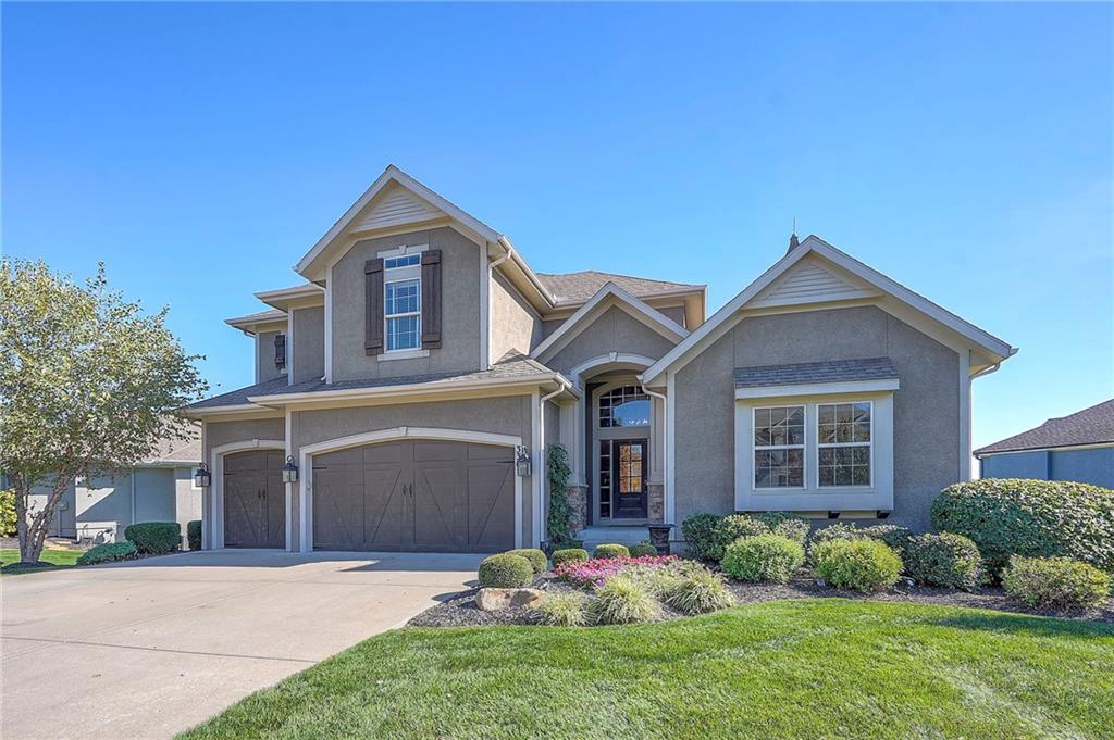Welcome to 3301 W 157th Street, a 5-bedroom, 5.5-bathroom 1.5-story home in the WatersEdge community where thoughtful design and everyday luxury meet seamlessly. From the vaulted ceilings to the striking floor-to-ceiling stone fireplace, every detail sets a refined and welcoming tone. The main floor features a spacious primary suite with a large walk-in closet and spa-like bath, a private office just off the entry, and a chef’s kitchen complete with a hidden walk-in pantry. A conveniently located half bath, laundry room, and mudroom with locker-style storage and a built-in bench make everyday living simple and efficient. Just off the main living area, a covered deck offers the perfect setting for entertaining or relaxing outdoors. Upstairs, a loft overlooks the main level and provides flexibility as a second living area, playroom, or creative retreat. Each of the three upstairs bedrooms has its own full en-suite bathroom, offering privacy and comfort for everyone. The finished walkout basement is built for entertaining, featuring a wide open game area perfect for a pool table, a private wet bar ideal for poker nights or football gatherings, and a spacious TV sitting area with access to a covered patio and backyard firepit. The fifth bedroom and a full bath are also located on this level, creating a private guest space or multi-generational living option. Located in the Blue Valley School District, this home offers a complete package of comfort, functionality, and luxury living.
