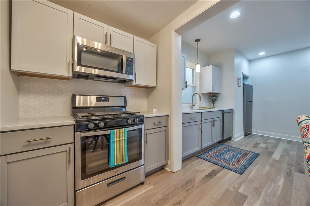 Timeless KC architecture meets modern joy in this gorgeous Pendleton Heights Shirtwaist. Stepping inside feels simply happy — bright, welcoming spaces with brand new natural white oak floors that flow throughout, complemented by a striking white oak staircase. The classic layout features a versatile first-floor bedroom that readily serves as a dining room, echoing how these historic homes were originally lived in. The kitchen is a blend of style and heritage, with crisp new cabinets, granite counters, a tiled backsplash, stainless appliances, and lighting that channels authentic Shirtwaist charm. Upstairs, you’ll find three more spacious bedrooms and another updated bath. Thoughtful laundry options include space for hookups in the first-floor bathroom closet (for a washer/dryer combo unit) and in the fresh/clean basement, as is traditional. Discover your private oasis: a newly built, oversized wood deck nearly as wide as the house itself — ideal for quiet evenings or weekend brunch. The inviting front porch is made for slowing down and watching the friendly neighborhood roll by. Live at the heart of Kansas City’s vibrant historic community. Just around the corner is the beloved Pendleton Heights Community Orchard, with Cliff Drive and Kessler Park offering trails, biking, and disc golf. This close-knit neighborhood also hosts “Coffee & Meet Your Neighbor” events — easy, welcoming ways to connect and become part of the community. Plus, it’s only minutes to the River Market, the Crossroads, and downtown KC. Zillow estimates the homes on either side are valued above $300K.
