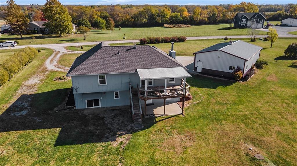 This charming 3-bedroom, 2.5-bath split-entry home sits on 3 acres and combines functional living with versatile spaces. Enjoy two spacious living areas, including a massive family room thoughtfully converted from the garage. Ideal for entertaining, hobbies, or a cozy retreat. The fully equipped kitchen flows effortlessly to a covered deck overlooking the backyard, perfect for outdoor dining and relaxation. A formal dining room provides ample space for gatherings of any size. A circular driveway leads to a generous 45’x30’ detached garage/workshop, offering abundant room for vehicles, projects, or storage. With its smart layout, expansive indoor and outdoor space, and prime location just minutes from I-35, this home offers the perfect blend of country charm and modern convenience.