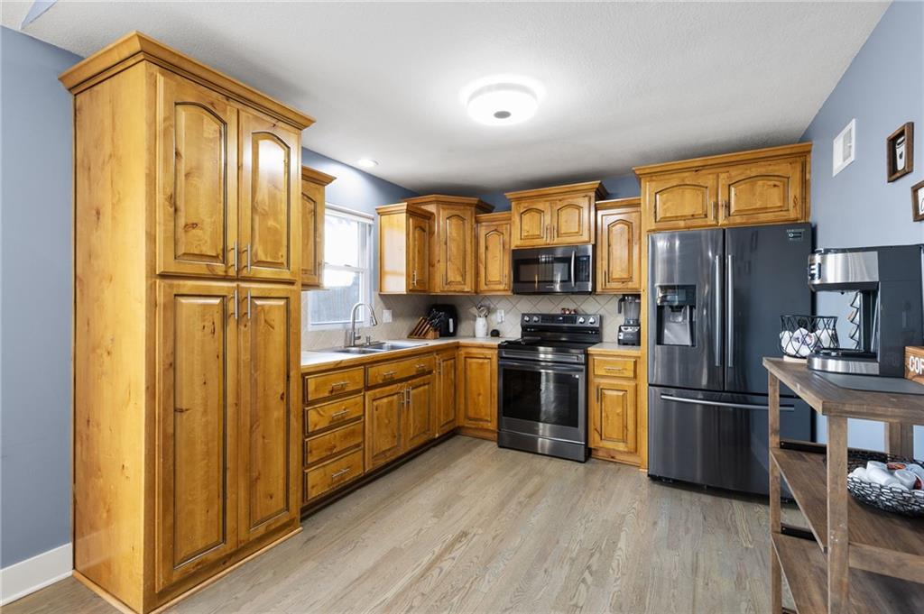 Welcome to this beautifully updated raised ranch! NEW ROOF AND GUTTERS installed last year. This home offers 3 bedrooms and 1.5 bathrooms, thoughtfully renovated throughout. Enjoy the refreshed bathrooms, and a gorgeous kitchen featuring real wood cabinets. The gleaming stained wood floors add warmth and character, while the finished basement offers a spacious recreation room that could serve as an additional bedroom or home office. The attached garage accommodates two vehicles, and the backyard is perfect for entertaining or relaxing outdoors. Conveniently located near major highways, you’ll have quick access to The Legends and Missouri in just minutes. Schedule your private tour today and discover all this home has to offer!