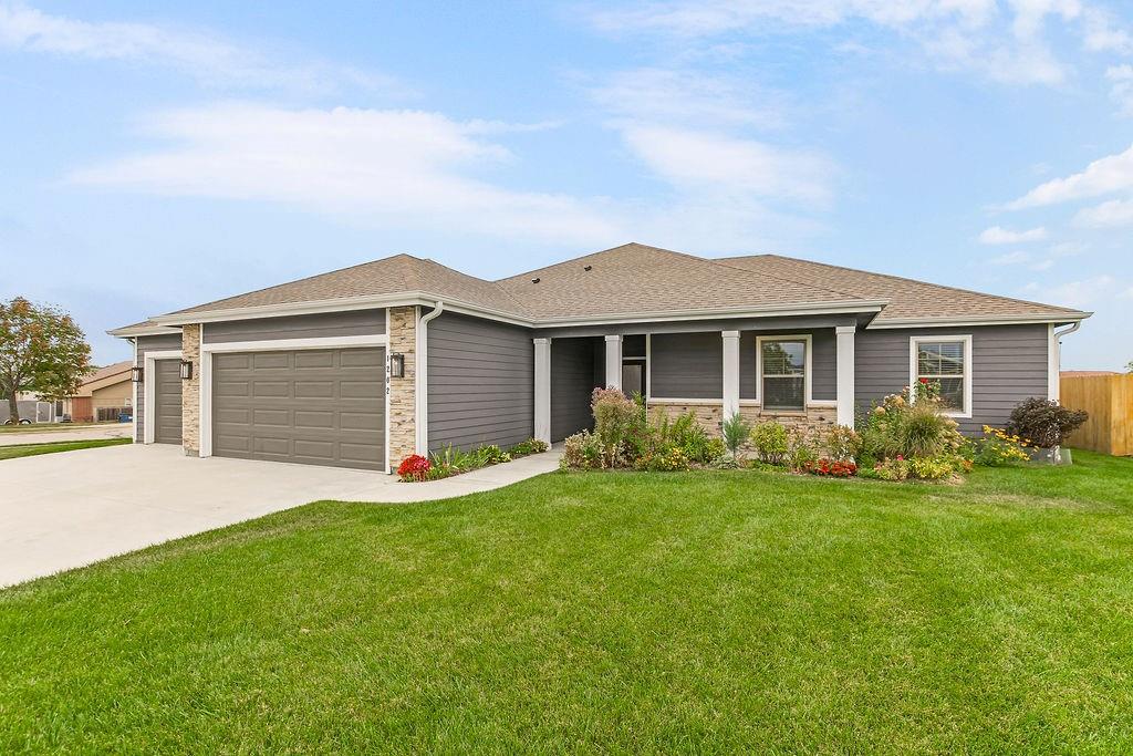 This beautifully updated ranch combines comfort, style, and effortless single-level living. The living room features a cozy fireplace and flows into a bright, two-tone kitchen with white upper cabinets, warm wood lower cabinets, quartz countertops, a center island, and a pantry—perfect for cooking and entertaining. Three spacious bedrooms include a primary suite with wood ceiling accent, a double vanity, and a bath with playful green touches. Outside you will find a fenced backyard with a patio, and enjoy the convenience of a three-car garage. This move-in ready home is as functional as it is inviting.