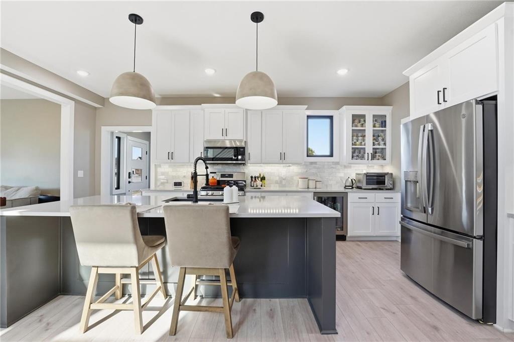 Exquisite Two-Story Home with Water Views in Warrensburg Discover a rare blend of modern luxury and natural beauty in this stunning two-story home overlooking a peaceful pond/lake where blue herons and even bald eagles are known to visit. With its striking stucco front and hardie board-style siding, this home delivers impressive curb appeal from the moment you arrive. It is so larger than it looks! Step inside and be greeted by soaring ceilings, abundant natural light, and expansive custom windows that showcase the serene lake views. The grand staircase makes a statement of its own—graceful, open, and truly fit for royalty. The heart of the home is the chef’s kitchen, designed for those who love to cook and entertain. Featuring quartz countertops, painted walnut cabinetry, a large center island, and a butler’s pantry, this kitchen offers both elegance and functionality. The open-concept living area flows seamlessly, highlighted by a modern linear electric fireplace and stylish white walls accented with black hardware for that clean, contemporary look. Upstairs, enjoy spacious bedrooms with large closets and an enormous walk-in primary closet that feels like a boutique. The large laundry room and built-in drop zone/mudroom bench add everyday convenience and thoughtful design touches. Step outdoors to a flat, black-fenced backyard and enjoy evenings under the open sky, or sip your morning coffee from the covered front porch as you watch the sun shimmer across the lake. The home also features custom-fitted smart blinds and in-ground lawn irrigation for effortless maintenance. This home is not your typical cookie-cutter design—it’s a statement of taste and individuality, where every detail has been carefully curated for comfort and style.