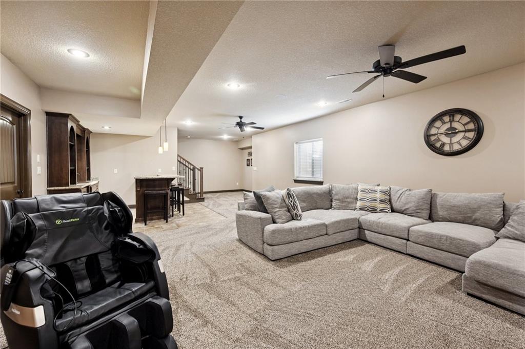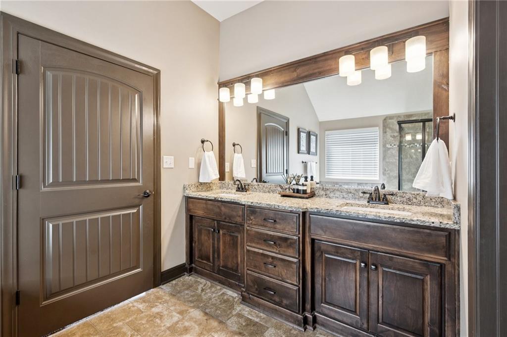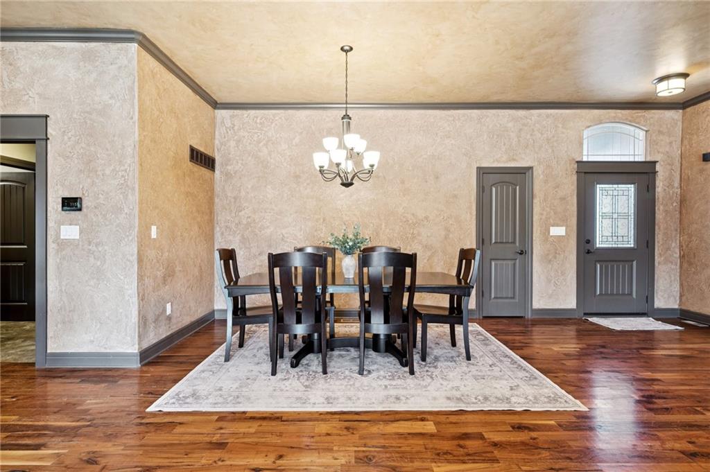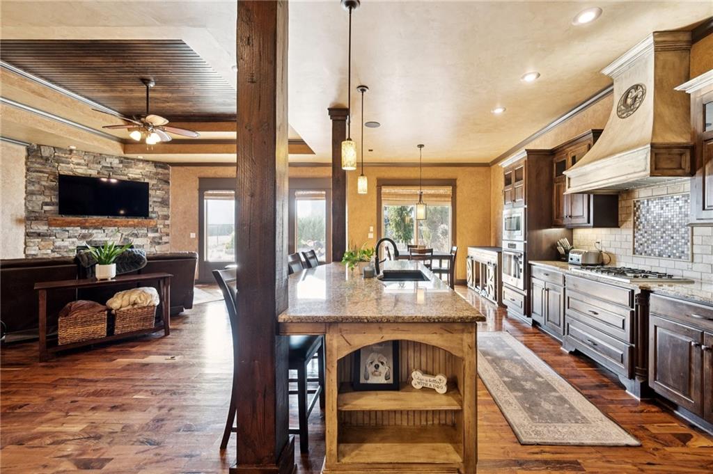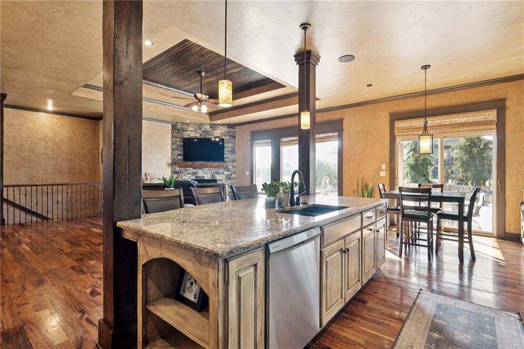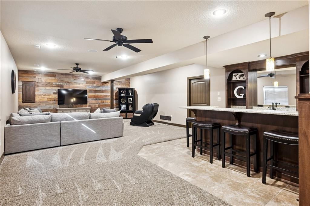Amazing 5-bedroom, 4-bathroom ranch home located in the quiet Estates of Chapman Farms! This spacious, open-concept layout is designed for comfortable living and elegant entertaining. The main floor features a formal dining area, a large kitchen with a walk-in pantry, stainless steel appliances, gas cooktop, and a generous island overlooking the expansive great room with a cozy corner fireplace. A bright breakfast nook completes this inviting space. The main level includes a bedroom perfect for a home office, a second bedroom, and the primary suite—complete with a comfortable sitting room, a luxurious bathroom offering a separate glass shower and soaking tub, and a walk-in closet with abundant storage. The lower level is made for entertaining, showcasing a massive recreation room with a full wet bar and stylish accent wall—ideal for hosting parties, game nights, or movie marathons. Two additional bedrooms and two bathrooms provide plenty of room for guests, with extra unfinished space ready for storage, a hobby room, or a home gym. Step outside to your backyard oasis featuring a covered porch with a stone fireplace, plus a stunning in-ground pool and hot tub—perfect for relaxing or entertaining.
