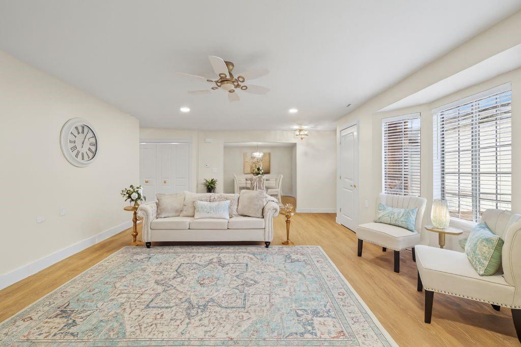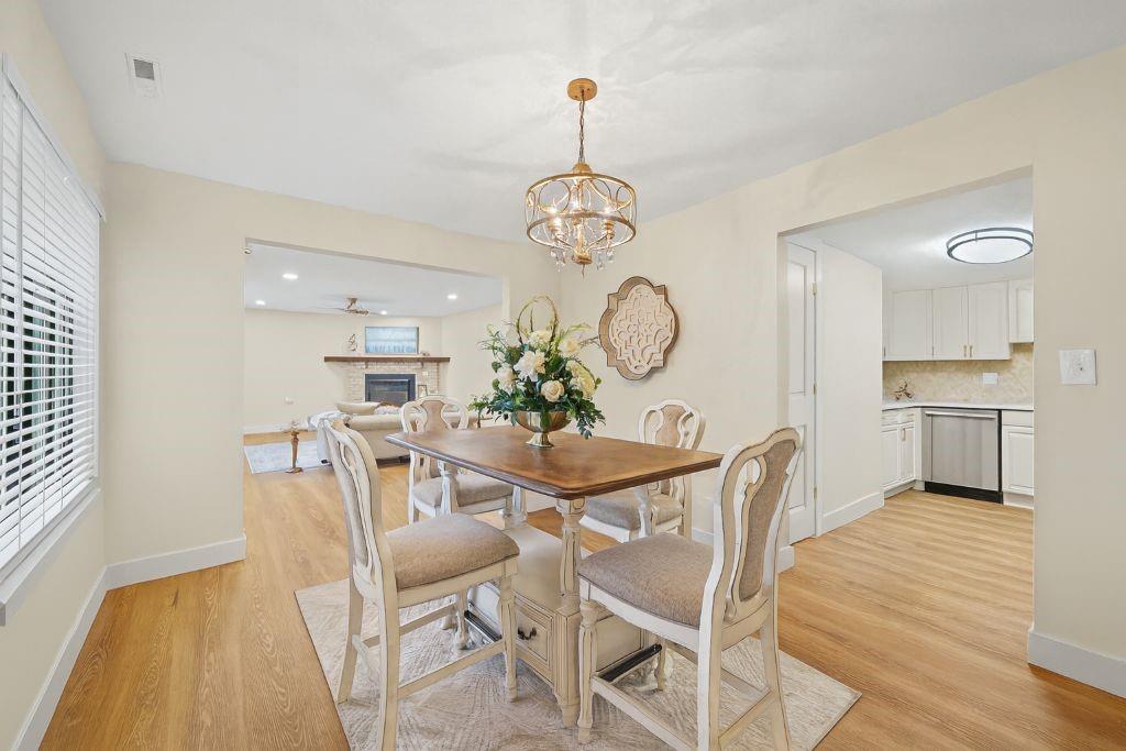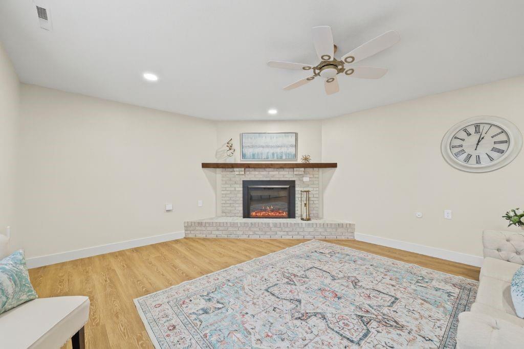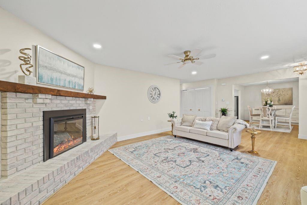 Welcome to stress-free living in the 55+ Foxwood Springs community in Raymore, MO. This beautifully remodeled home features all-new LVP flooring, baseboard trim, lighting, textured ceilings, fresh paint, updated faucets, quartz countertops, window treatments, custom cabinets, and custom closet shelving. The spacious dining room includes a built-in buffet and cabinets, and a new home office with built-in desk overlooks a large window. The kitchen offers new stainless appliances, updated cabinets, new walk-in pantry, quartz counters, and backsplash. The living room includes a new electric fireplace with remote for year-round comfort. Popcorn ceilings removed, new doors, new landscaping, and more. Enjoy maintenance-provided living with HOA services that include 24-hour security, emergency response, lawn care, snow removal, trash, exterior and interior maintenance, and utilities (water/sewer). A one-time $3,000 access fee provides use of community amenities including indoor pool, fitness center, library, lounges, meeting rooms, billiards, shuffleboard, garden plots, greenhouse, picnic area, and on-site dining, with optional housekeeping and transportation services. Experience the perfect blend of independence and community—truly a wonderful place to call home.