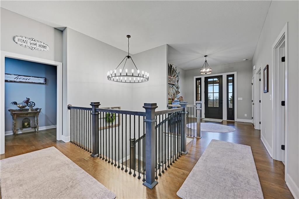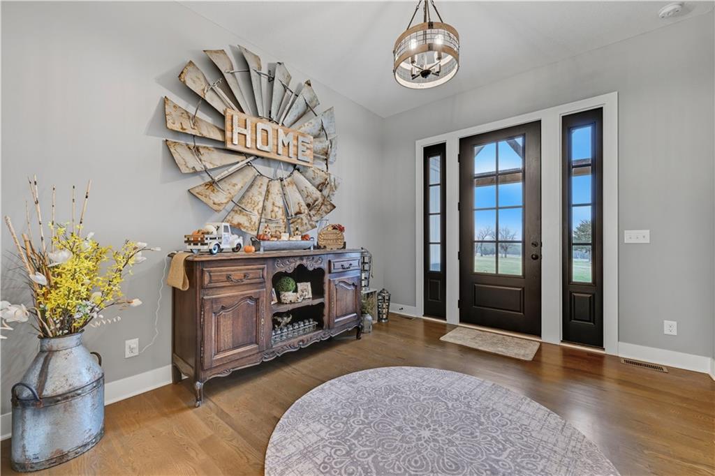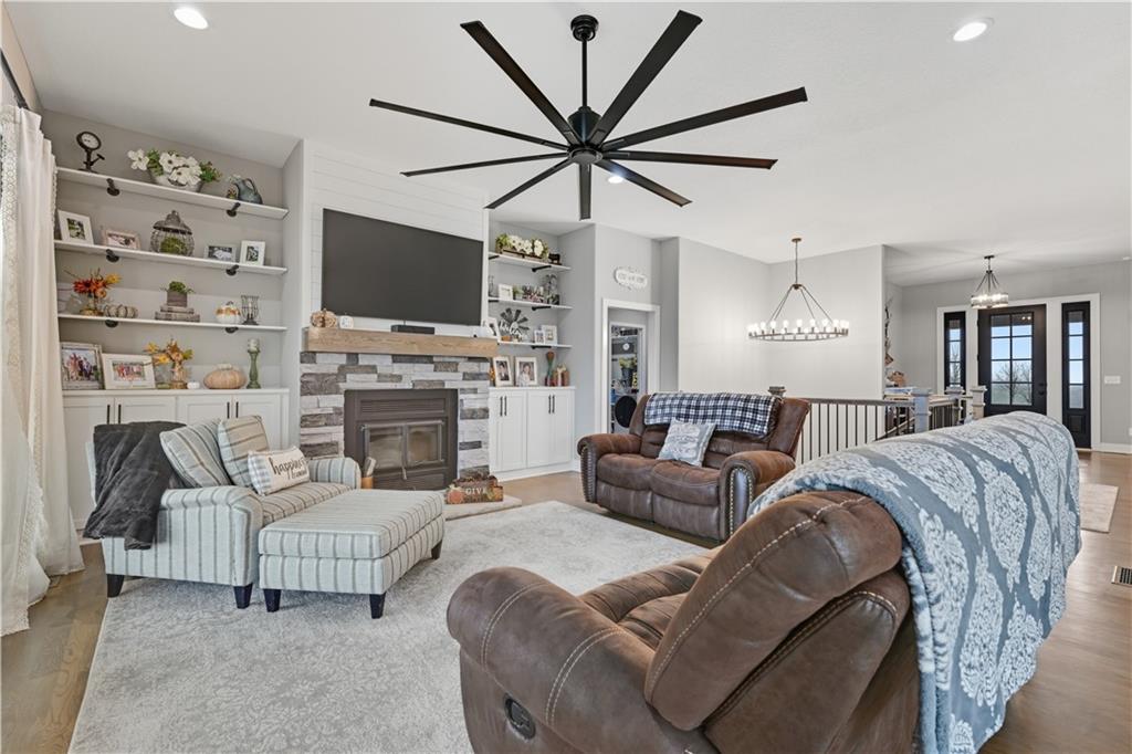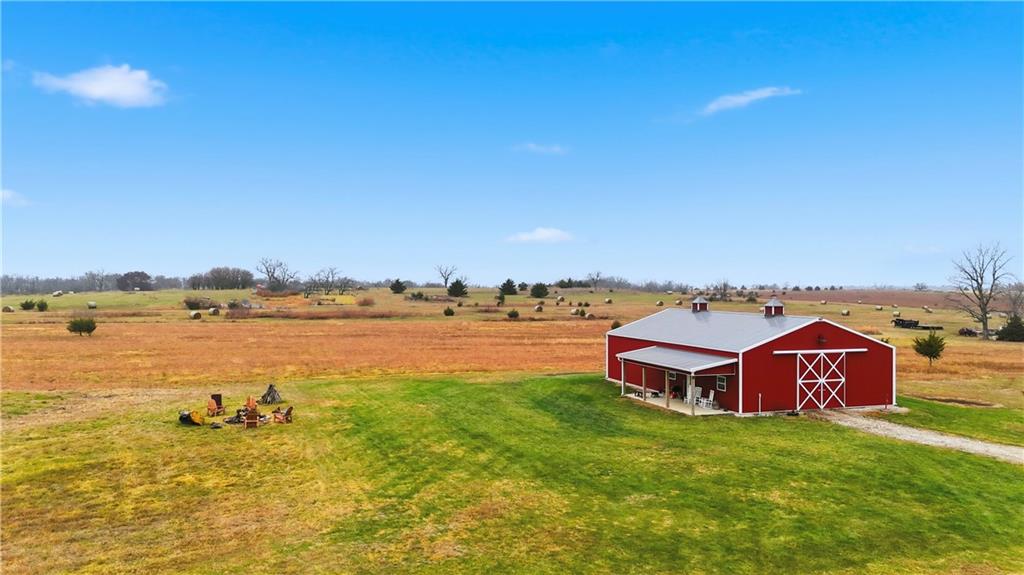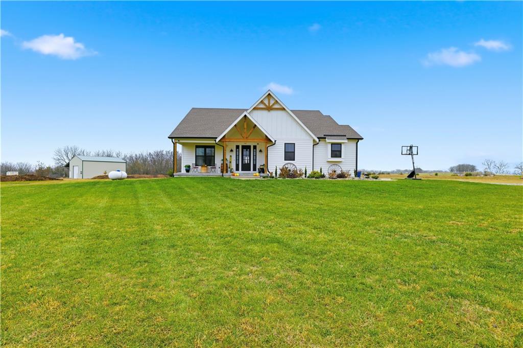 Your Dream Home Awaits! This gorgeously appointed 4 Bedroom 3 and 1/2 Bathroom Reverse Story 1.5 is better than NEW! Your Future Home offers an open concept main level with a grand foyer, second bedroom/office, Chefs Delight Kitchen, Dining Space, Great room, Primary suite, Laundry room, mud room and oversized garage. The Charming kitchen offers a HUGE walk-in Pantry, 6ft island with Quartz countertop, loads of storage, 36" Gas stove, and Painted Custom cabinetry. Your Great room offers a wood burning fireplace and double sliding doors that open to the covered porch to take in your country views. Enjoy retreating to your spacious primary suite where you can relax in your walk-in shower with custom tile. Your magnificent walk-in closet connects conveniently to the laundry room. Head down stairs to your sizable recreational room that connects your exercise room, bonus room, and 2 additional bedrooms joined by a Jack & Jill bathroom. Need storage? You've found it. The amount of storage this home offers is substantial. Enjoy the space your acreage offers for you to enjoy. Fish in your 1/3 acre pond, store your toys in the 40x60 shop/outbuilding with concrete & electricity or turn it into a barn for horses or other animals, start a large garden, your options are almost endless. Easy highway access. Only 14 minutes from Louisburg for shopping and restaurants, 8 minutes from Linn Valley Lakes, and 21 minutes La Cygnes Lake. Tour this home today before you miss out! Professional photos taken tomorrow.