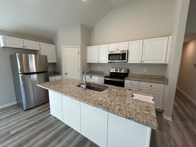 Built in 2021, this Split Entry home has a bright, open-concept main level featuring soaring vaulted ceilings throughout the Living Room, dining area, and Kitchen. Durable luxury vinyl plank flooring flows seamlessly through the entire home. The Kitchen offers a huge island with seating, granite countertops, stainless steel appliances, and a roomy pantry. Entertaining is effortless with the kitchen opening directly to the living and dining spaces, plus sliding doors that lead to the deck overlooking the expansive backyard — perfect for summer barbecues and relaxing evenings. Buyer & Buyer's Agent to verify all information including square footage, zoning, taxes & room sizes during the Inspection Period. Convenient main-level laundry, a large primary suite with an ensuite boasting double vanity, tiled shower, and private water closet. Two additional bedrooms and a full bath complete the upper level. Head downstairs to the cozy finished family room with half bath — ideal for movie nights, a playroom, or home office.