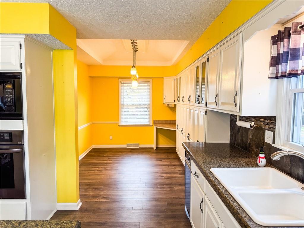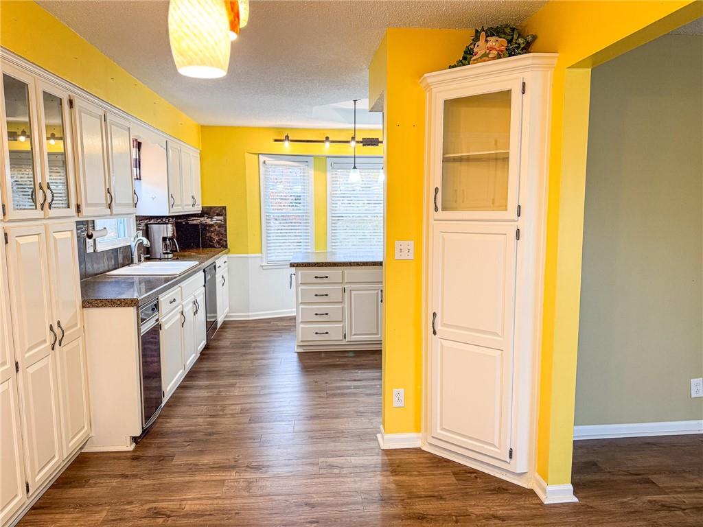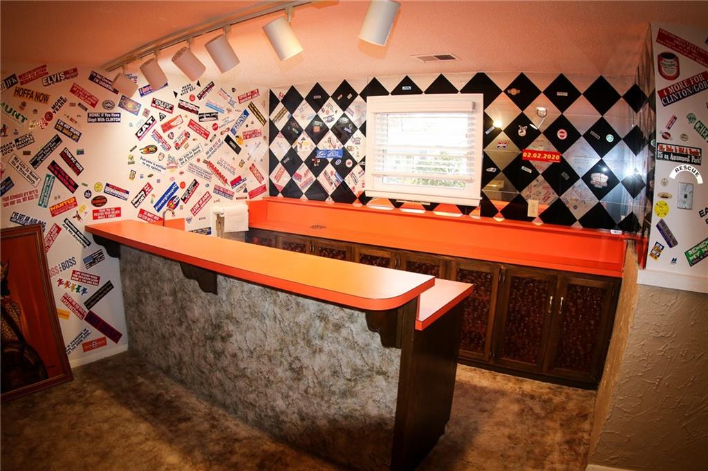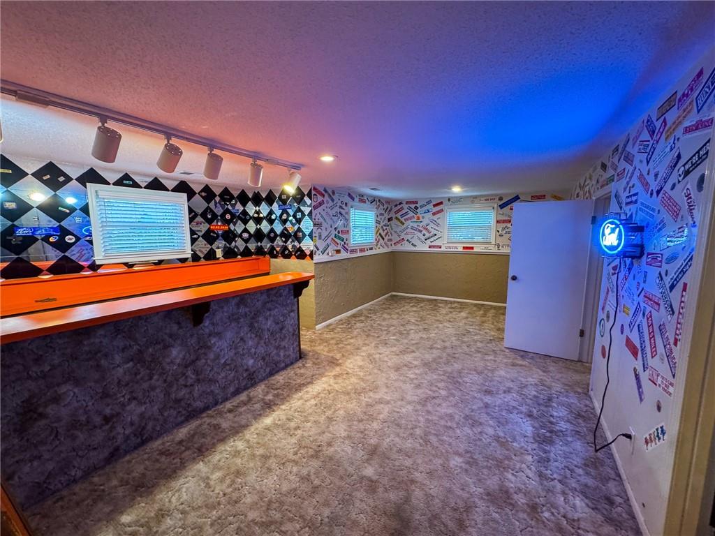 Awesome house in great neighborhood, many updates, with a playful retro vibe. Kitchen and dining space with TONS of cabinets, large island with cooktop. Main level has plenty of living space, great room with gas fireplace and sliding door to newer composite deck, formal living room, then there is the primary bedroom with slider door access to back deck, updated bath with large walk in shower, also convenient walk in closet that passes into an office or nursery, with another bedroom and hall bath with whirlpool tub, downstairs garage level has great retro recreation room with wet bar, mini fridge, guest bedroom and private half bath, utility room has a safe/storm room.Furnace & AC almost 3 yrs. Garage has large cedar closet. House has extensive landscaping front and back. Fully fenced back yard. Deck runs across back of house, slider doors in great room AND primary bedroom, composite decking and metal railing. Interesting stone features on front of house.
