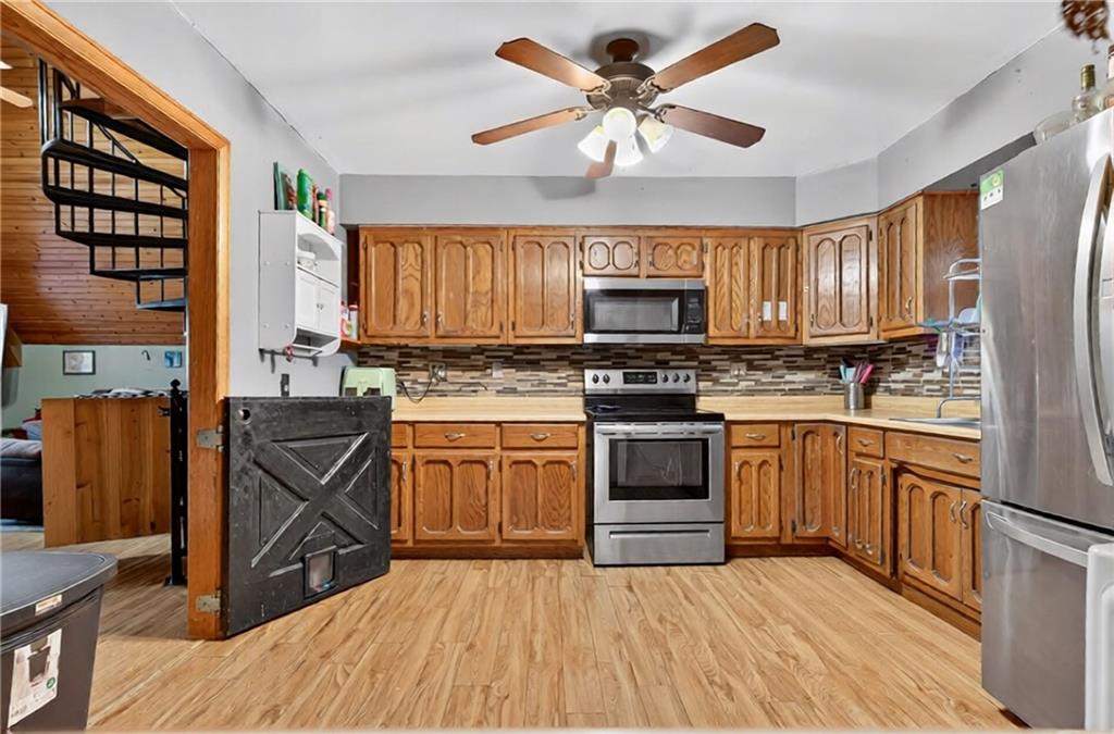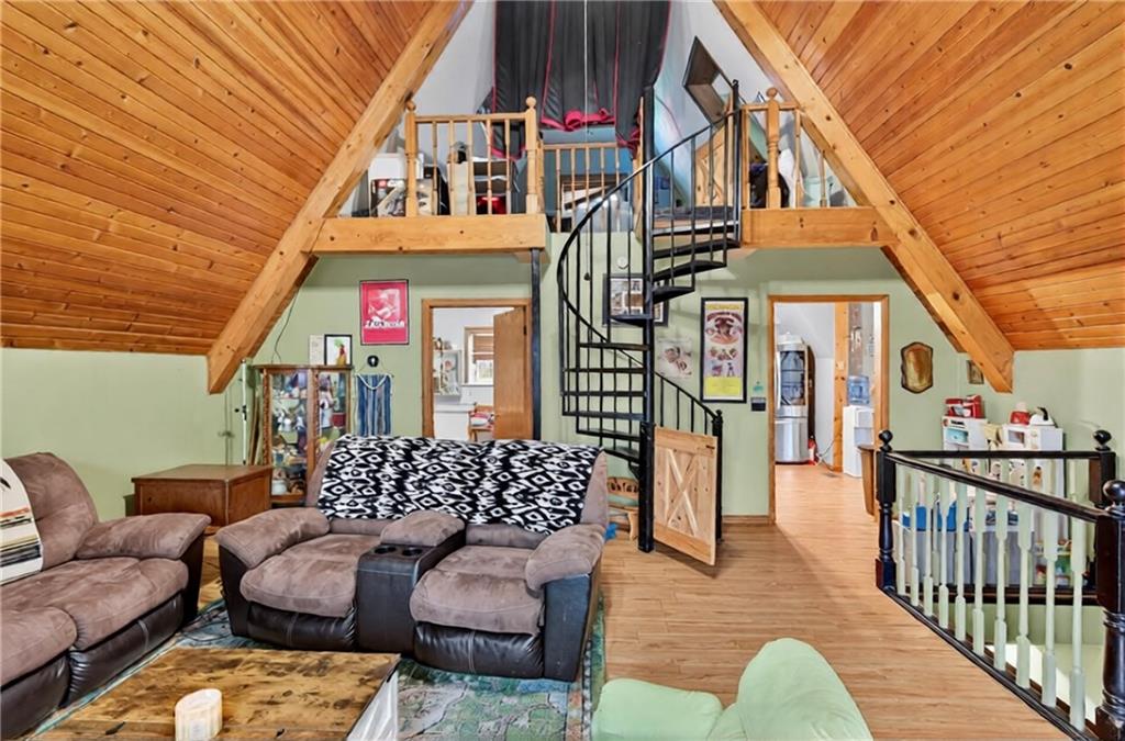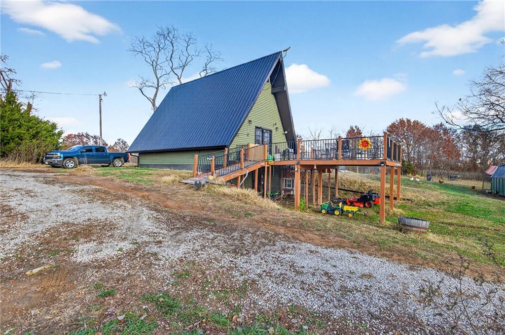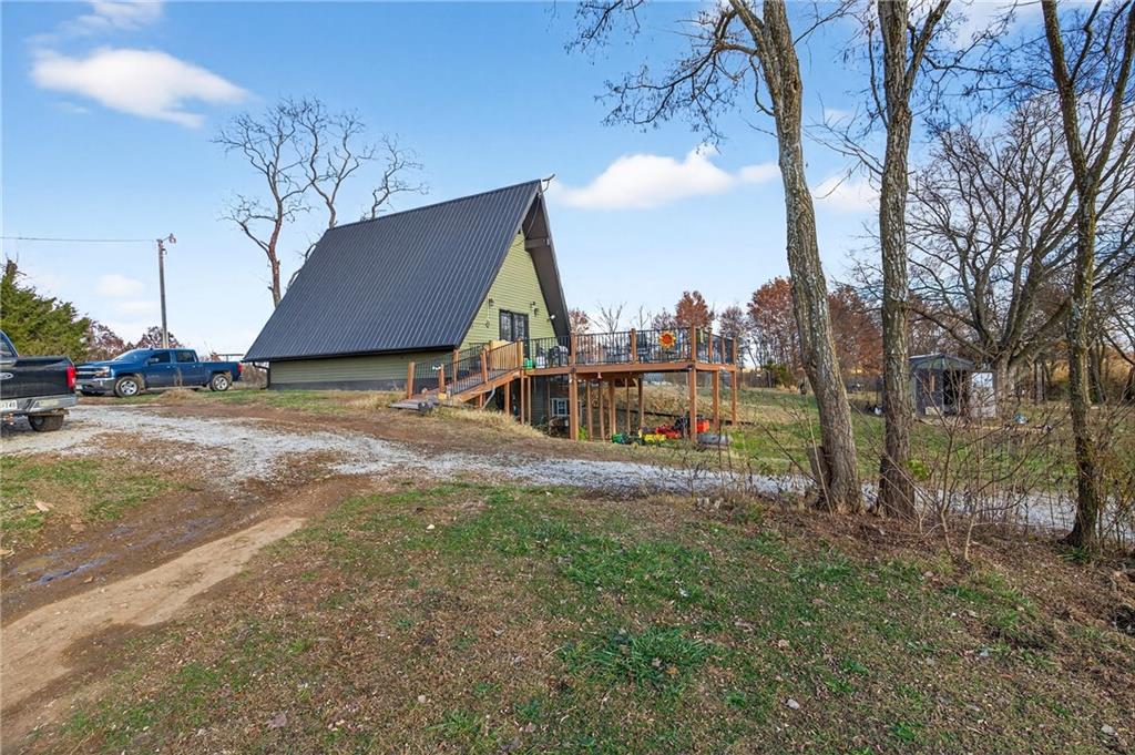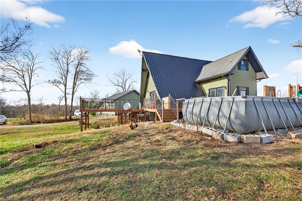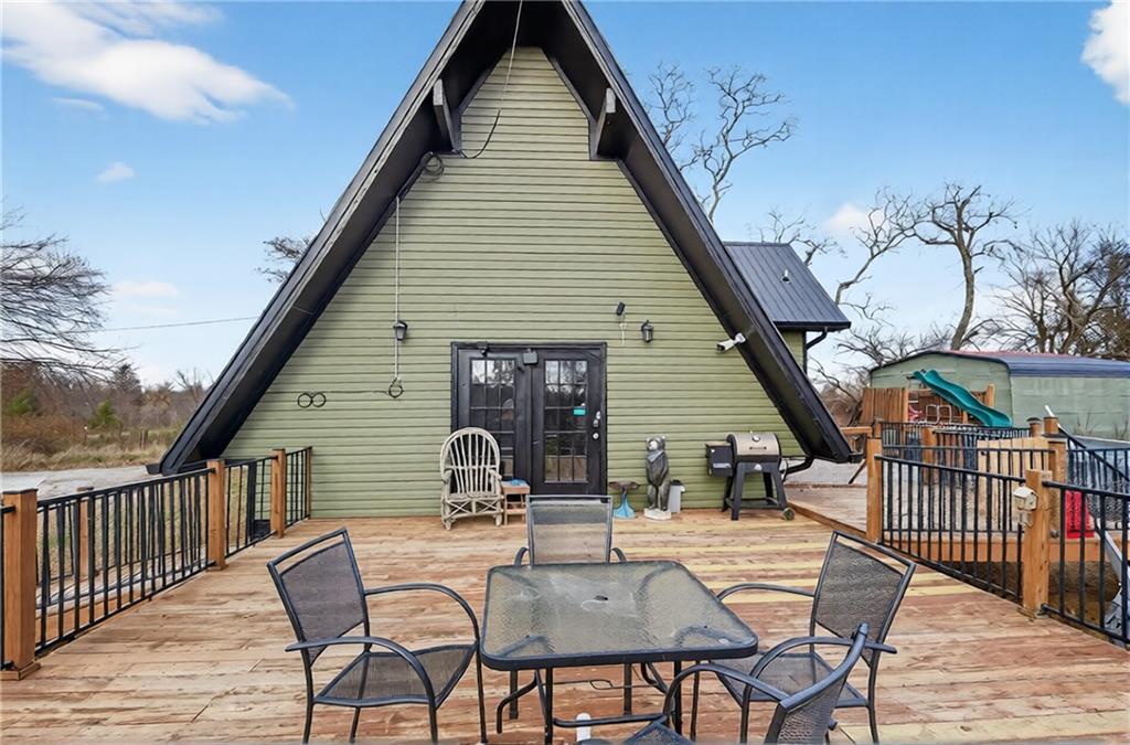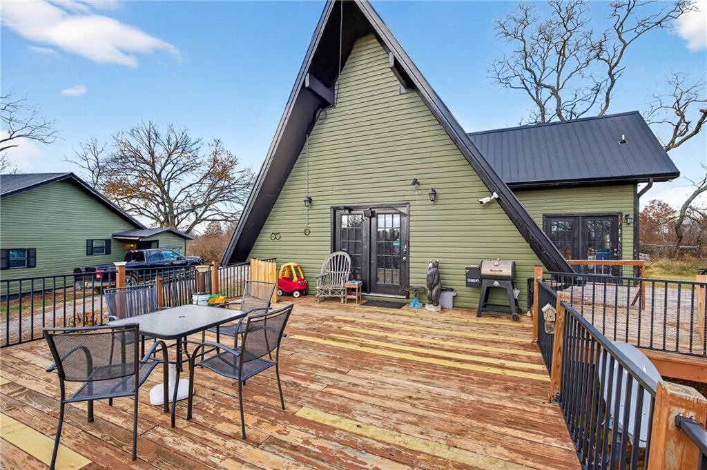 Experience A-frame charm combined with modern improvements across this 1.9-acre property that includes a full guest house and inviting outdoor amenities. A great setup for multi-generational living or extra space. Located in a convenient rural corridor between Nevada, Missouri and Fort Scott, Kansas. The primary A-frame style home, built in 1992, offers 1,484 sq. ft. with a warm and inviting loft layout. As you enter, you’re greeted by a striking vaulted wood ceiling and an open living space filled with natural light. The kitchen sits just off the living room and includes updated appliances, making daily living and entertaining a breeze. This home offers 2 bedrooms, 1 non-conforming bedroom, and 2.5 bathrooms. The main-level primary suite provides comfort and privacy, while the finished walkout basement adds versatility for additional living space, guests, or hobbies. Step outside and enjoy a large deck overlooking the above-ground pool, plus a charming firepit area complete with swinging benches — a perfect setting for quiet evenings or gathering with friends and family. The acreage features peach trees, pear trees, grape vines, and blackberry bushes, adding to the peaceful rural appeal.An added bonus is the 840 sq. ft. guest house, offering 2 bedrooms, 1 non-conforming bedroom, and 1 bathroom — ideal for guests, extended family, or potential rental income. Major improvements in recent years include: Central heat & air, Newer metal roofs on both homes and all outbuildings, Newer siding on both homes,Newer windows and doors, Newer flooring, Newer well water filtration system. And if it sweetens the deal…the owners are even willing to leave the chickens — gobble, gobble! Important Note: The sellers lead a very busy lifestyle. To help buyers envision the layout and potential, some rooms have been virtually staged. The virtual staging is simply provided for convenience and visualization.