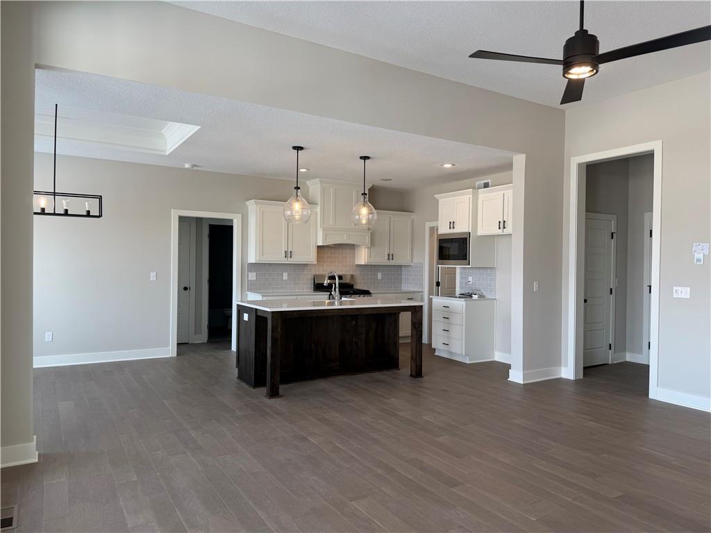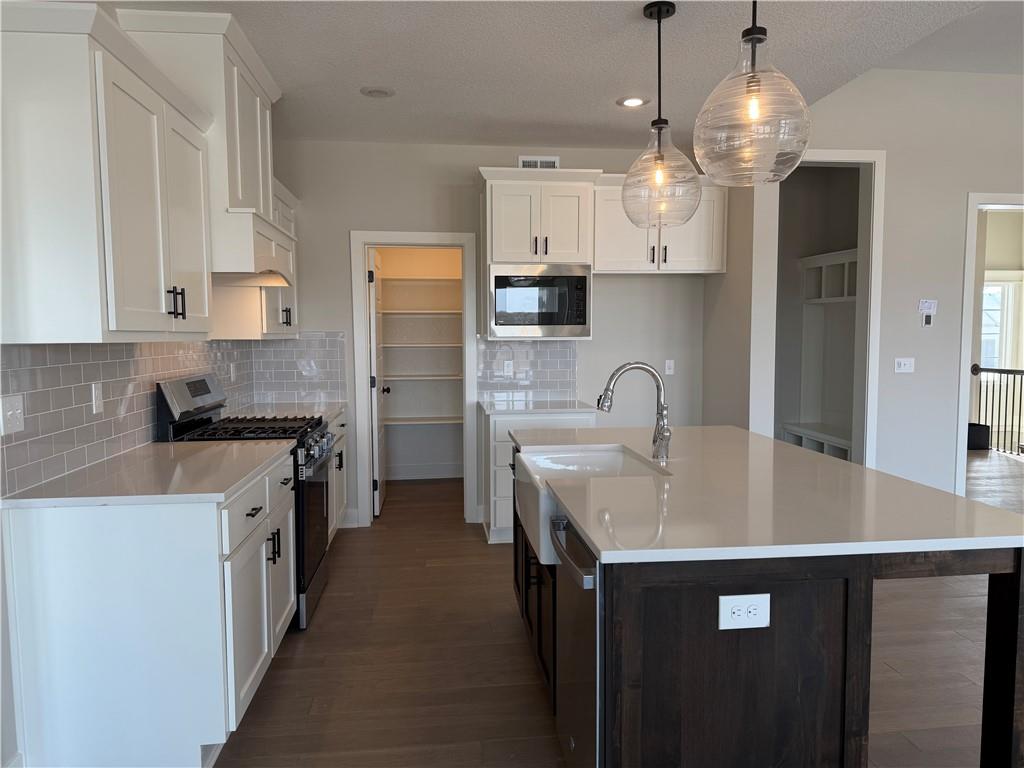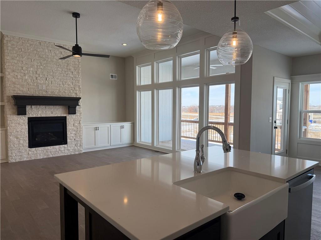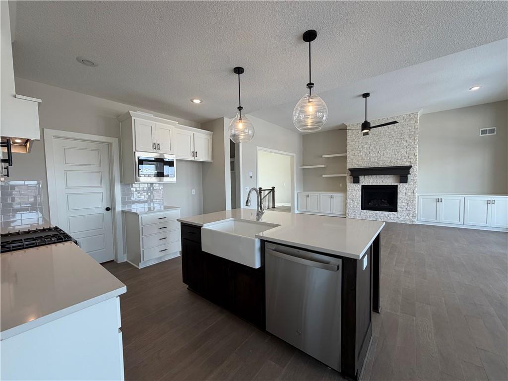 Prieb's all-new Payton Rev 1.5 plan is a stunning home located in a tranquil setting. This beautiful home features a spacious great room with a floor-to-ceiling stone fireplace and hardwood floors. The light and bright kitchen boasts a large island with an apron-front sink, recirculating stove hood, built-in microwave, soft-close drawers and doors, and painted kitchen cabinets. The main level of this home features three bedrooms, while the finished walkout lower level has an additional bedroom, a family room, and a third full bath. The walk-up wet bar is a great addition, perfect for entertaining guests or enjoying a night in with family. The covered 17x8 deck provides the perfect spot to enjoy the beautiful views, while the large walk-out lot provides easy access to the outdoors. This home is a great option for anyone looking for a functional and beautifully designed living space in a serene setting. Please note that the photos provided are of a previously completed spec home, and some features may not be included. It is recommended that buyers work with their agent to confirm the details of the home.