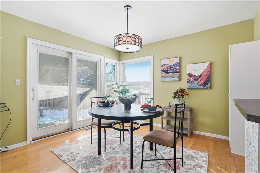 Beautiful maintenance-free townhouse in a quiet West Lawrence neighborhood. Rare end-unit offers lots of windows & sunlight. Spacious open floor plan with hardwood floors and nicely updated kitchen & appliances. Main floor primary bedroom and 2 more bedrooms & bonus room upstairs. Amazing oversized deck that is surrounded by large shade trees. Pella windows with built-in blinds.