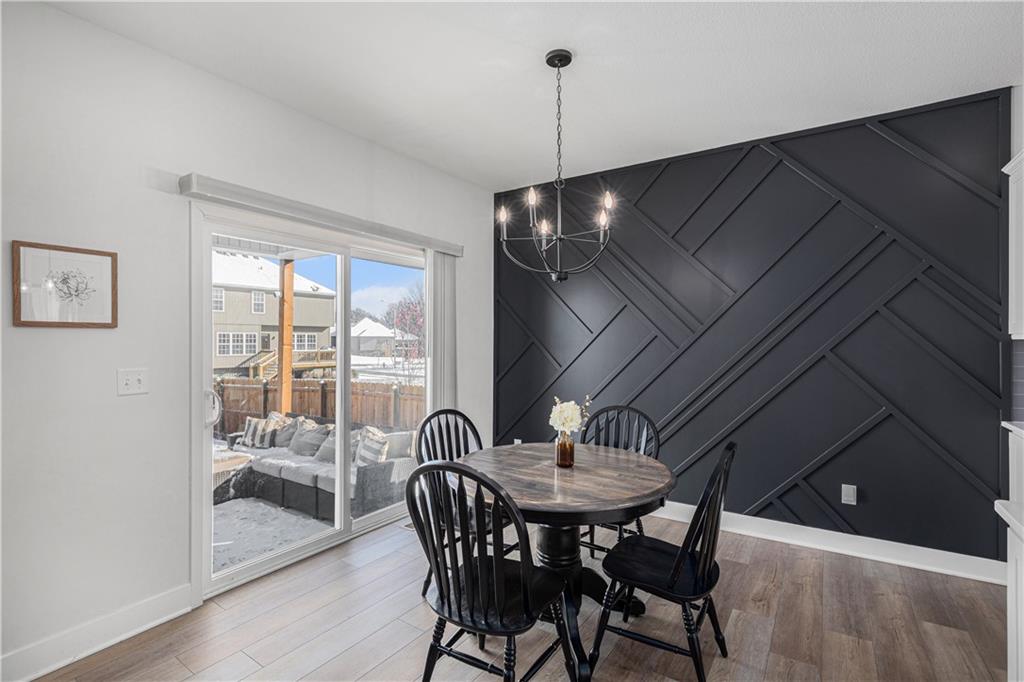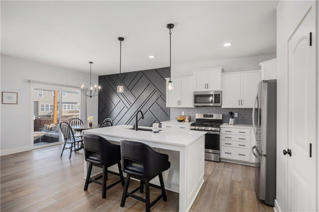Why settle for new when you can embrace the elegance of this beautifully upgraded home, built in 2022. Step inside to discover a light, bright, and airy ambiance that creates an irresistible invitation to unwind and relax. This stunning residence features 4 spacious bedrooms and 3 full baths, complemented by an attached two-car garage and a fully fenced, beautifully landscaped yard that offers both privacy and curb appeal. As you enter through the front door, you'll be greeted by soaring high ceilings, gleaming wood floors, and an open floor plan that seamlessly flows throughout. The heart of the home is the expansive white kitchen, showcasing luxurious quartz countertops and a chic grey tile backsplash. The oversized island provides additional seating, while a walk-in pantry, gas stove, and stainless steel appliances complete this chef’s paradise. The kitchen elegantly opens to a sunlit living room adorned with a tiled fireplace, floor-to-ceiling windows, and a charming dining area featuring an accent wall that adds character and warmth. Your primary suite is conveniently located on the main level, offering a generously sized bath with a double vanity, a spacious shower, and a walk-in closet that dreams are made of. Two additional bedrooms and a full bath are also located on the main floor, ensuring comfort and convenience. Don’t forget the thoughtfully designed laundry and mudroom, situated off the primary suite. Venture downstairs to the amazing newly finished lower level, where a cozy family room awaits, complete with a newly installed wet bar, a full bedroom, and an additional bathroom. There’s even an unfinished storage space for all your organizing needs! Step outside to an extended patio surrounded by a privacy fence, making this yard a perfect 10 out of 10. Nestled in the highly sought-after Platte County School District, this home is part of a vibrant community that offers a pool, playground, and scenic trails.