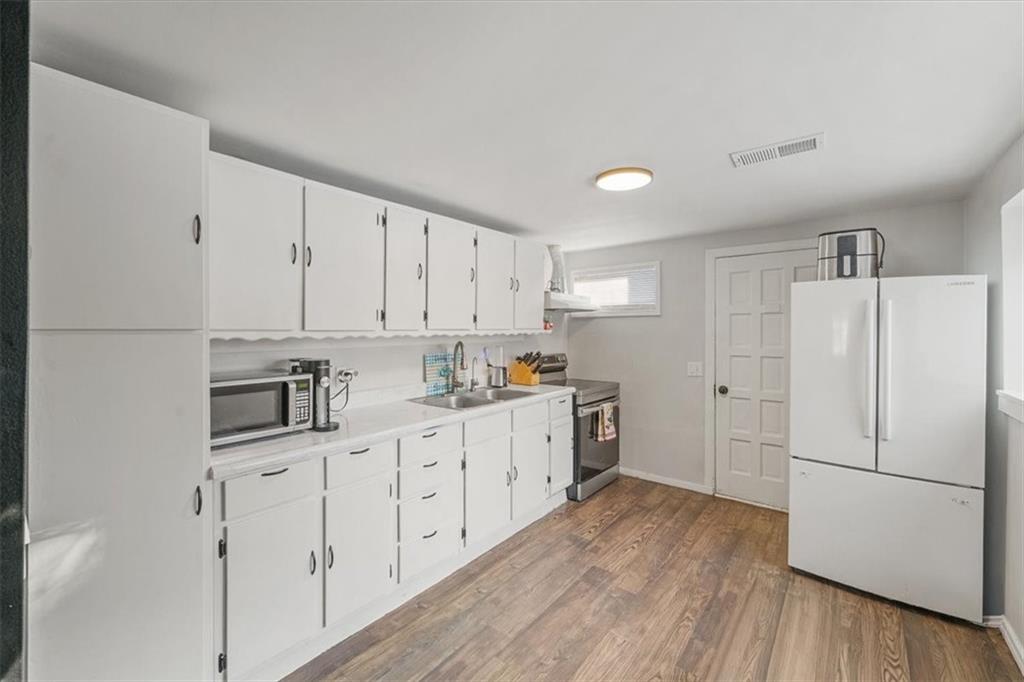 Welcome to a bright and refreshed home that offers far more space than you’d expect. Inside, you’ll find updated flooring throughout, fresh paint, modern lighting, and thoughtful touches that make each room feel warm and inviting. The living area brings in great natural light and is anchored by a clean accent wall, built-in shelving, and a sleek ceiling fan. The oversized kitchen provides an impressive amount of storage, updated counters, newer appliances, and plenty of room to add a dining setup or coffee bar. This home offers flexible living with multiple bedrooms and bonus spaces that can easily serve as offices, playrooms, or creative studios. Each room has been improved with updated floors, modern fixtures, and appealing neutral finishes to make the home move-in ready. The renovated bathroom features fresh tile, a newer vanity, and a clean, modern look. A dedicated laundry area adds even more convenience and storage options. With its mix of updates, versatility, and useful square footage, this home is a strong fit for anyone needing extra rooms or multi-use spaces without sacrificing comfort or style.