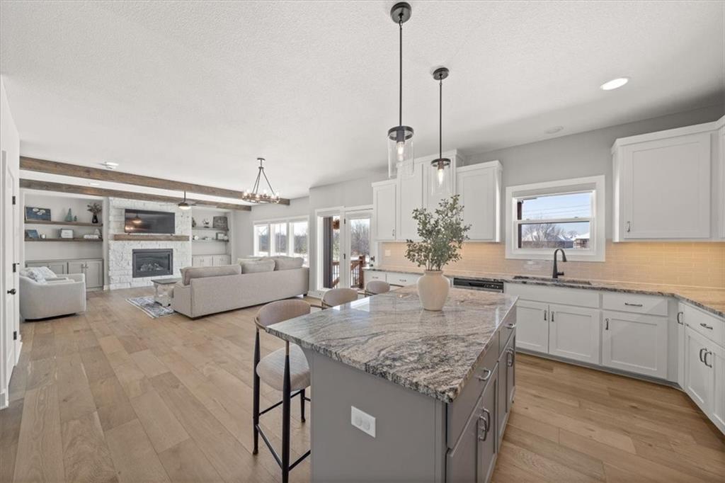 Welcome to your dream home in the highly desirable Benson Place Landing! This exquisite 2-year-old home blends the best of comfort, thoughtful design, and unbeatable location. Enjoy the feel of new but with upgrades you won’t find in current new construction. Step inside to discover an open yet defined layout, perfect for both everyday living and entertaining. Gorgeous ceiling beams accent the expansive great room, while the flexible front room, complete with wainscoting, offers space for a formal dining area, home office, or playroom. The kitchen is a showstopper, featuring a convenient coffee bar, stone countertops, and generous storage. Upgrades that truly set this home apart: Designer light fixtures throughout: modern, stylish, and energy-efficient. Beautifully landscaped yard for instant curb appeal and outdoor enjoyment. Newly installed iron rod fencing in backyard. An extended concrete patio ideal for gatherings, grilling, or relaxing. 4-car tandem garage, equipped with its own electric heater provides endless options: extra vehicles, storage, workshop, home gym, or creative space. Unwind in the sprawling primary suite with a spa-inspired bath, oversized walk-in closet, and direct access to the laundry room for ultimate convenience. Step outside to the covered 14x12 deck. Enjoy unbeatable community amenities: (2) swimming pools, splash park, playground with soccer goals, miles of scenic trails, and lush nature areas, all just steps from your door. Commuters will love the quick access to I-435, I-35, and 152 Hwy, only 20 minutes to KCI or downtown Kansas City! Don’t miss your chance to own this like-new, move-in ready home with premium upgrades and a prime Northland location.