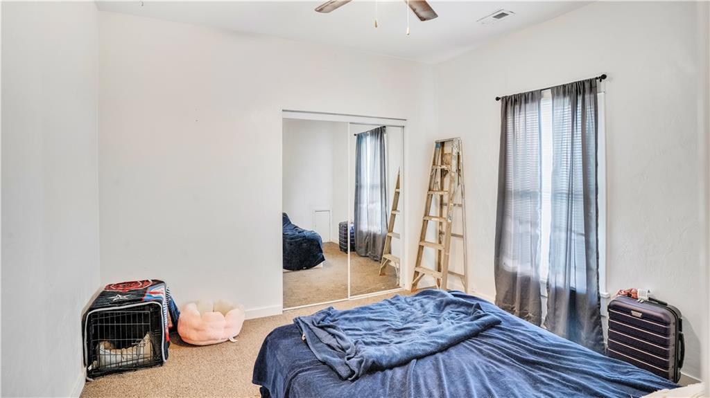 Bedroom featuring carpet, a closet, and a ceiling fan