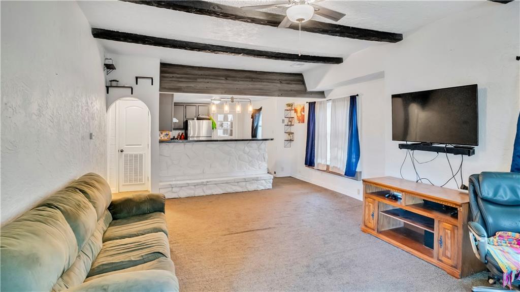 Living room with beam ceiling, light colored carpet, ceiling fan, and arched walkways