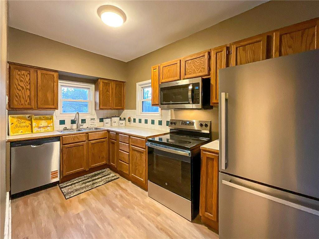Cozy and turn key, this home features 9' ceilings, all new flooring, fresh paint, new stainless steel kitchen appliances and a fully renovated bathroom! 2 bedrooms on the main level and large third bedroom on the second level that offers a variety of uses. Central heating and cooling system with a 90+ high efficiency gas furnace, ceiling fans and Newer double hung vinyl thermal pane windows throughout. 1car attached garage and a Completely fenced backyard with gate and alley access. Located just a few blocks from grocery store and restaurants!