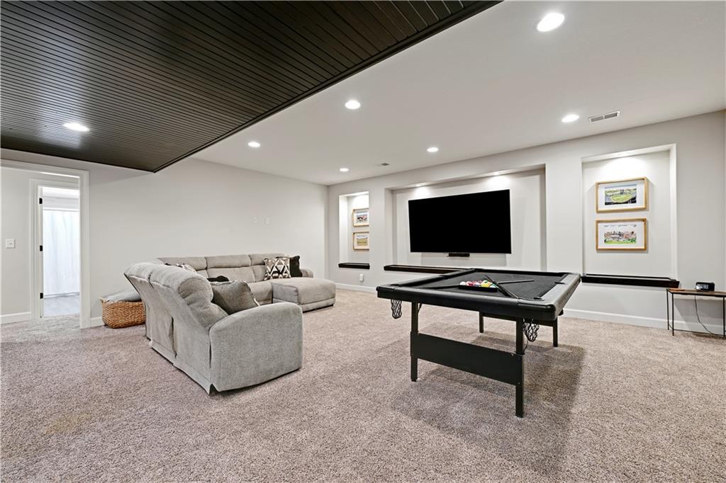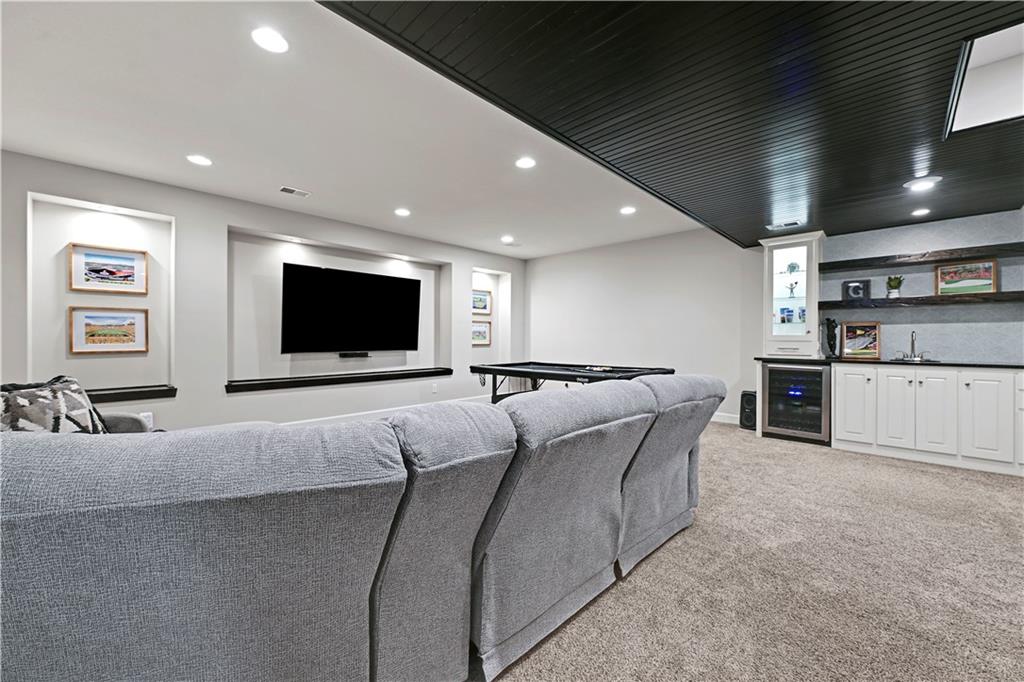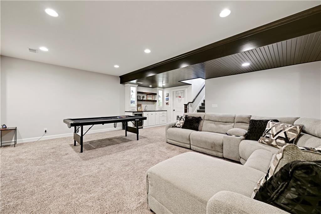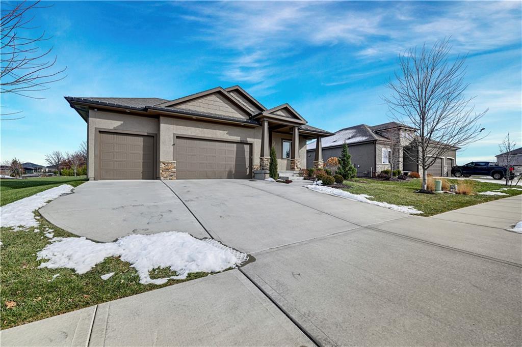 Welcome home to this Gabriel Homes Richmond floorplan free-standing villa in Cedar Creek – The Meadows, featuring new interior paint throughout much of the home. This low-maintenance stucco and stone exterior welcomes you with a deep covered front porch and upgraded leaded-glass front door. The main level offers mixed-width hardwood floors, a spacious office or 4th bedroom with built-ins, and a full bath with tiled shower and granite vanity. The kitchen shines with a large walk-in pantry, expanded island, granite countertops, custom painted cabinetry with under-cabinet lighting, and stainless appliances including a KitchenAid induction cooktop and Bosch oven and dishwasher. The adjoining living room features a stacked-stone gas fireplace. The main-floor primary suite includes a tray ceiling, a huge walk-in closet connected to the laundry room, and a spa-like bath with double quartz vanity and tiled walk-in shower. The finished basement offers a wet bar, large living area, two generous bedrooms, and a full bath. Enjoy a private backyard backing to a school with a covered patio, expanded paver patio, and lush perennial landscaping. Deep painted garage is EV-wired. HOA includes lawn care and snow removal. Resort-style Cedar Creek amenities include pools, pickleball, trails, lake, gym, clubhouse, and more—an exceptional value.