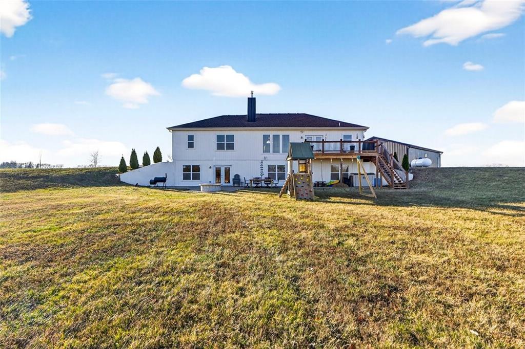 This reverse 1.5-story home was built with intention, offering peace, space, and true main-level living on serene acreage. The ADA-friendly floor plan is completely flat throughout, creating an effortless flow from room to room—including a flush, walk-in shower. The main living area was freshly painted in December 2025. Inside, the home features high-end maple hardwood floors known for exceptional durability, granite countertops, and smart-home capabilities. The spacious primary suite includes a large walk-in closet and an oversized master bathroom designed for comfort and ease. For added buyer confidence, the home was recently appraised in December at $680,000 prior to listing. Outdoor living is a standout feature with an oversized back deck and an even larger patio below, ideal for entertaining or enjoying peaceful sunsets. The property also includes a custom archery range and a Jamesport Builders 1,500 sq ft, 4-car metal shop, offering endless options for storage, hobbies, or business use. A winterized chicken coop adds charm and function, featuring durable caging with removable custom corrugated panels and an infrared heat lamp. Panels can be removed in warmer months for full airflow. Chickens stay with the property, providing fresh eggs; the rooster is confident, calm, and non-aggressive. The property offers six total garage spaces, and select items, including the Bad Boy mower, are negotiable. Review all photos to fully appreciate the home, land, and lifestyle this property offers within its boundaries. This home has been meticulously taken care of and ready to be embraced by it's next owner.