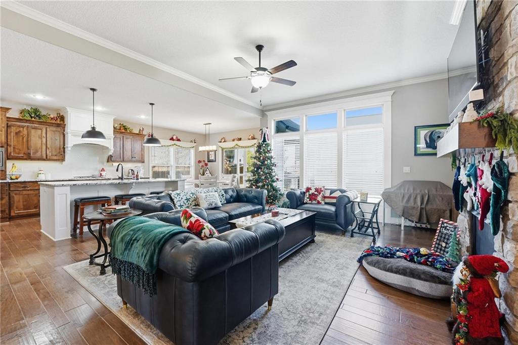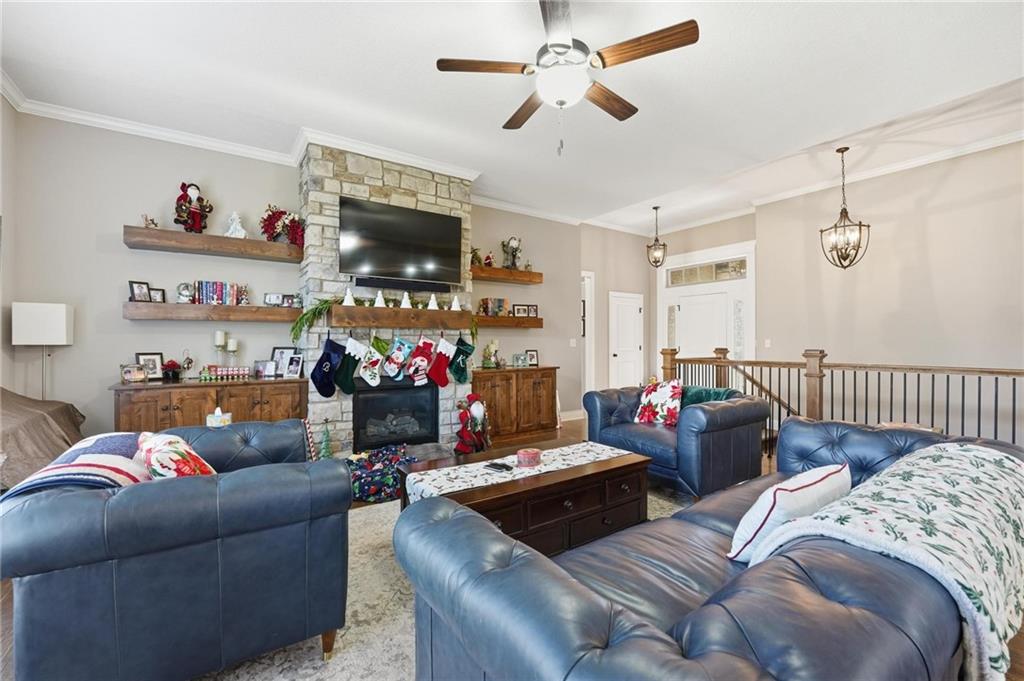 Welcome to this gorgeous former model home that feels warm and inviting from the moment you step inside! The open main living area is perfect for gatherings, with a soaring gas fireplace framed by beautiful custom built-ins that add charm and character. The kitchen is a dream—gas cooktop, custom cabinetry with tons of storage, a large pantry, stunning granite countertops, and a painted island and hood that make the space pop. The dining area is filled with natural light, creating the perfect spot for everyday meals or special occasions. Rich wood floors add warmth throughout the main level, which features two spacious bedrooms, including a primary suite you’ll love—complete with a spa-like bath offering a separate tub and shower. Downstairs, you’ll find a huge rec room, two more bedrooms, and plenty of unfinished storage space. Located in the sought-after Staley Hills community, you’ll enjoy amenities like a swimming pool, playground, and scenic walking trails. This home blends warm style and comfort!