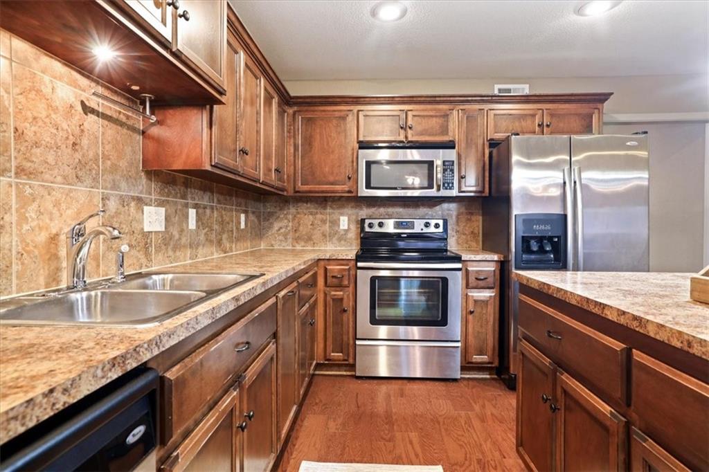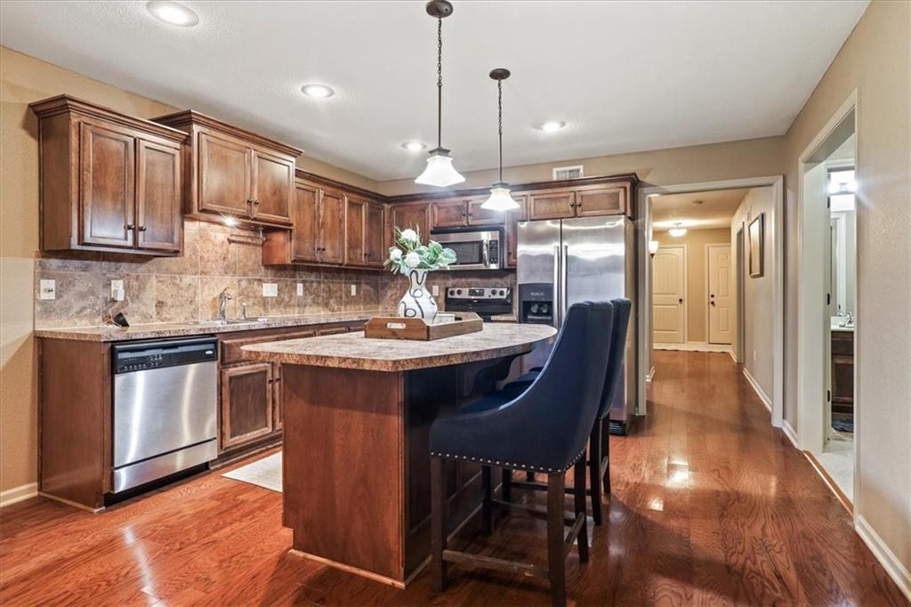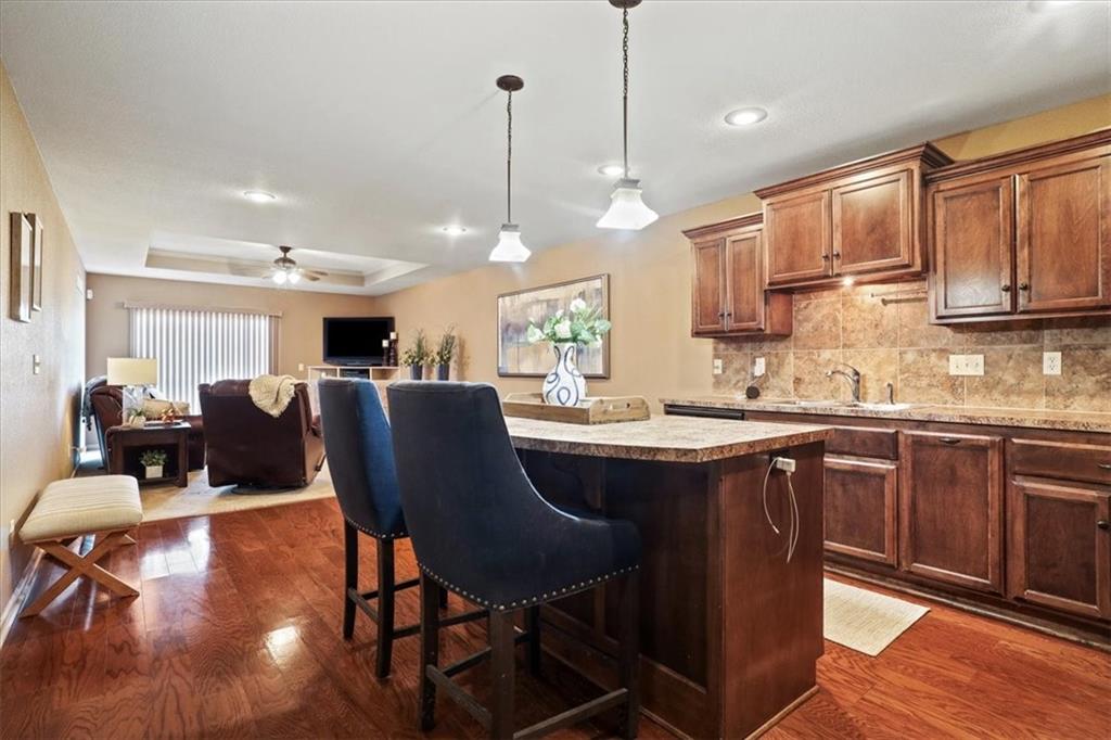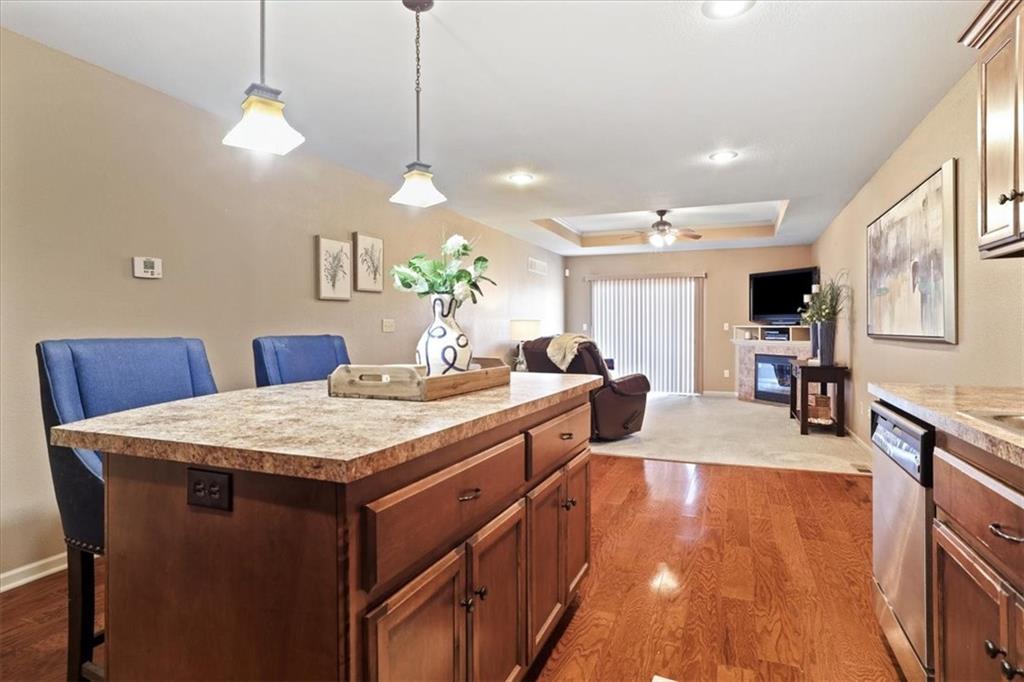 Welcome to Tuscany Hills! This well-maintained ranch-style townhome offers the ease of main-level living combined with an expansive finished walkout basement, all situated on a quiet cul-de-sac lot. The open-concept main level features warm hardwood floors, a spacious living area, and a beautifully designed kitchen with abundant cabinetry, center island, — ideal for both everyday living and entertaining. The primary suite provides a comfortable retreat with a generous bathroom and ample closet space, while additional main-level rooms offer flexibility for guests, office space, or hobbies. The finished walkout basement greatly expands the living area, offering endless possibilities for a recreation room, media space, or entertaining area, with direct access to the patio and backyard. Enjoy outdoor living from the elevated deck overlooking the greenspace, along with additional covered patio space below for relaxing or hosting gatherings. Additional highlights include main-level laundry (washer/dryer stay), multiple living spaces, and low-maintenance townhome living in a desirable community close to shopping, dining, and convenient highway access. Move-in ready with space to live, entertain, and enjoy — this Tuscany Hills townhome is ready to welcome you home.