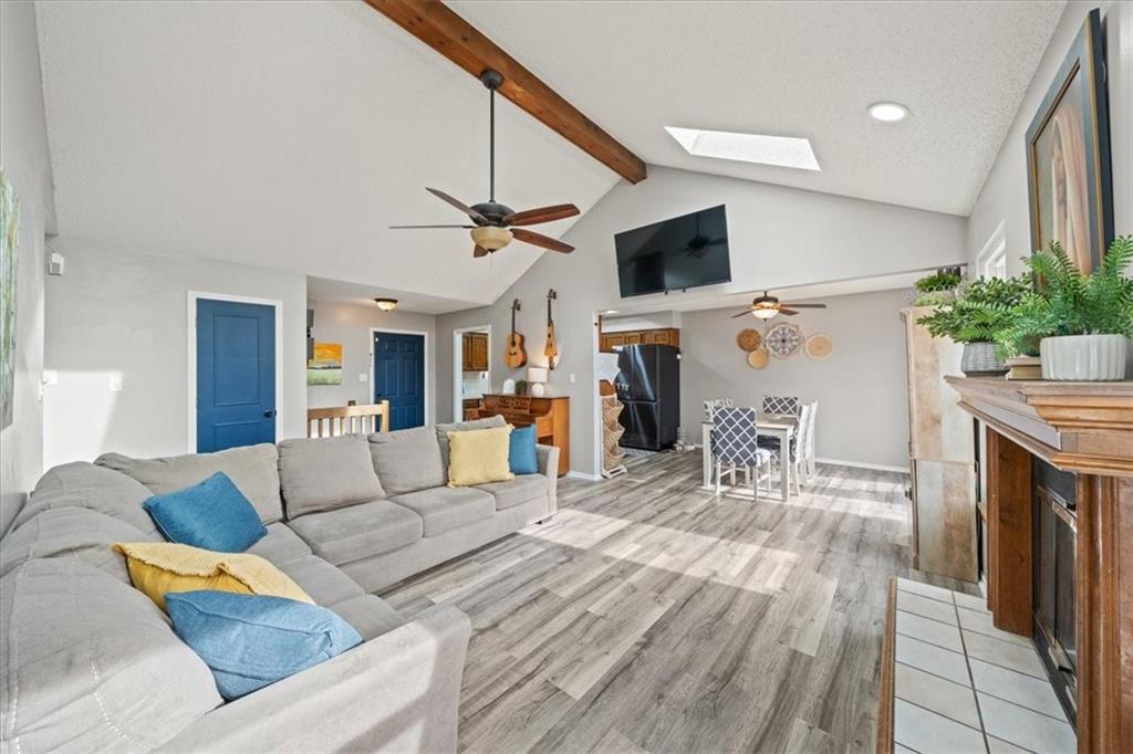 This beautifully maintained and updated raised ranch is conveniently located minutes from nearby parks, shopping, restaurants and highway access and showcases thoughtful updates throughout. Step inside to discover luxury vinyl plank flooring flowing seamlessly through the main level, complemented by fresh neutral paint and distinctive blue accent doors. The main living area impresses with abundant natural light, soaring vaulted ceilings with exposed beams, and an electric fireplace serving as an elegant focal point. The open-concept layout flows into a well-appointed kitchen featuring stainless steel appliances, generous cabinetry, and innovative Bluetooth-controlled recessed lighting—perfect for creating ambiance for any occasion. French doors open onto the rear deck, leading to an expansive quarter-acre lot with complete privacy fencing—ideal for pets and children to enjoy safely.The primary bedroom features dual closets and a private en-suite bathroom. Two additional bedrooms offer ceiling fans and recessed lighting with adjustable night-light settings. A full bathroom with tub/shower combination completes the main level.The lower level provides exceptional versatility with a recreation area featuring a built-in rock climbing wall and monkey bars. This level includes laundry facilities, a fourth non-conforming bedroom, and a third full bathroom—ideal for multi-generational living or potential rental income. The oversized two-car garage offers workshop space and convenient access. Recent improvements include a new roof, new HVAC system, new double-hung windows, enhanced insulation, updated privacy fencing, and new solar panels. Meticulously cared for and move-in ready!
