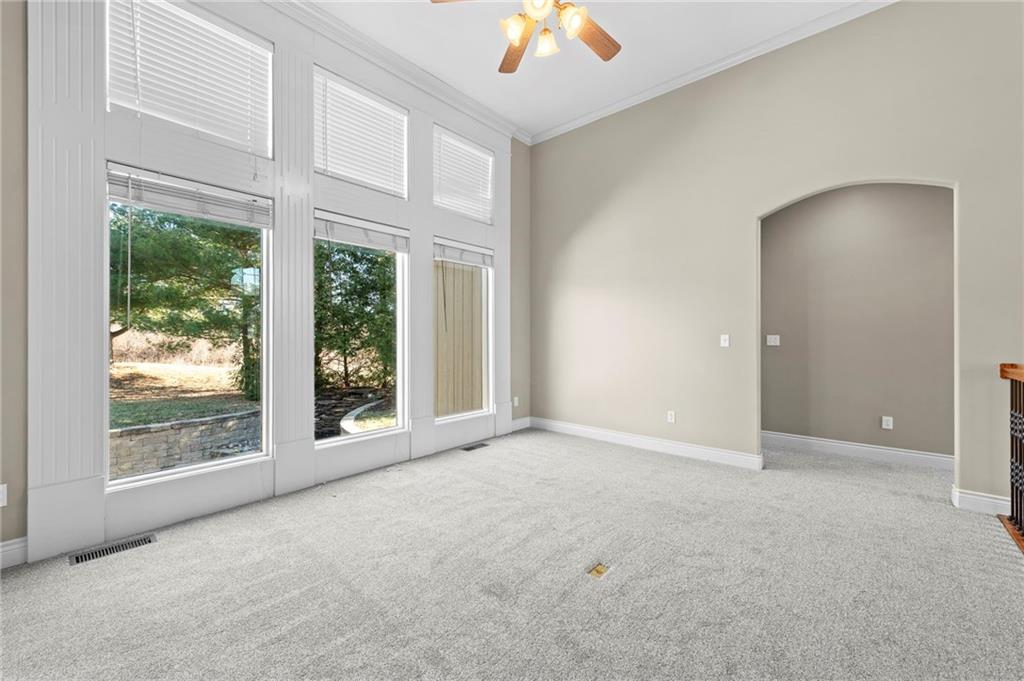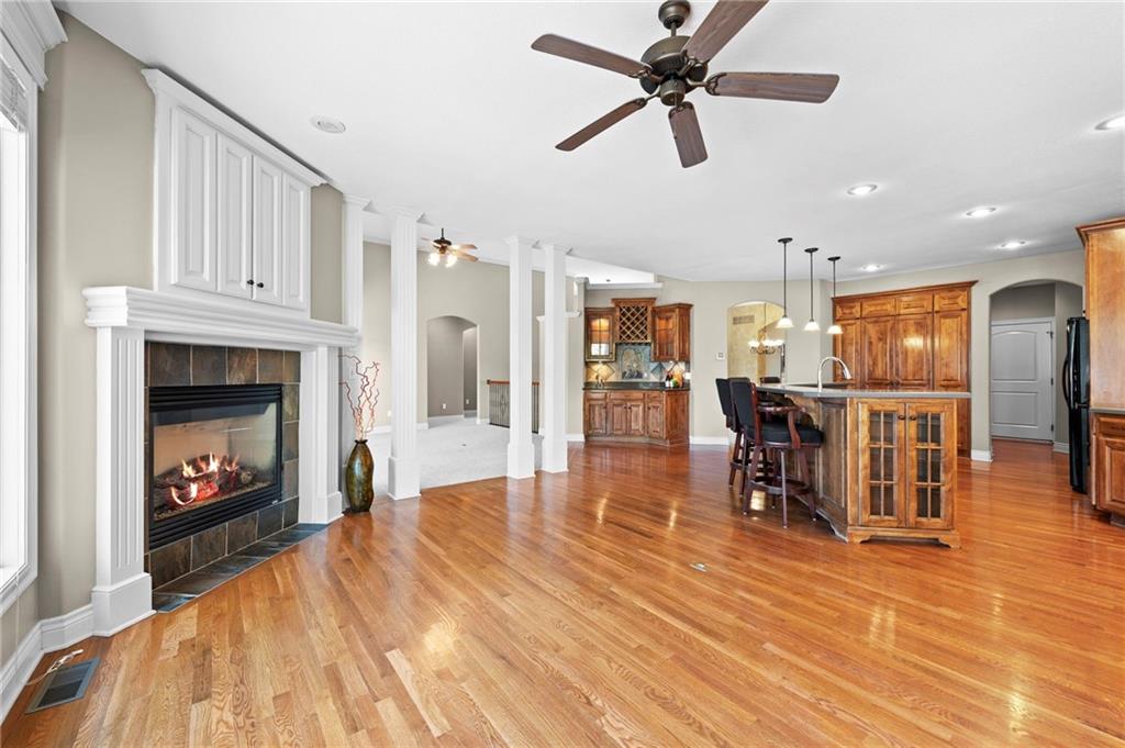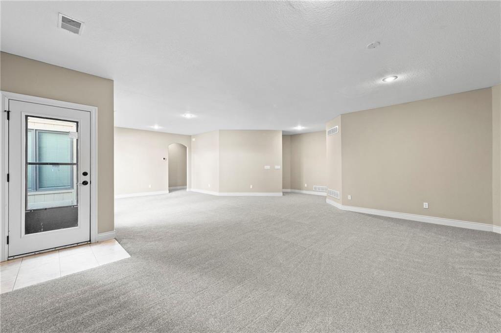 Custom Reverse 1.5 Story home situated perfectly on a private, treed, TRANQUIL lot! Timeless and elegant, this uniquely designed open and spacious floor plan is one-of-a-kind! Soaring ceilings and treed views! Optional 2nd Bedroom, or office on main floor and formal dining off of the entry. Great room that is open to a cozy hearth room w/ gas fireplace, Wetbar, casual dining, hardwood floors, and extended kitchen island with Electric Cooktop, Hardwood floors and HUGE walk-in Pantry! Your own personal Grill Deck from hallway close to kitchen and laundry. Open Deck off of breakfast and hearth room, walk out to your outdoor private OASIS! Stunning, stamped concrete veranda to custom courtyard, waterfall feature, fire pit and mature trees! Perfect for those shaded summer evenings! Spacious Primary Suite and Bath boasting Ceramic Tile Floors, double vanity, whirlpool tub, walk-in shower, and fabulous walk-in closet! Walkout/Walk-up LL with stairs to the concrete Veranda. Open Recreation Room, 2nd Bedroom suite, 3rd full bath, 4th Bedroom and tons of storage! All new carpet throughout! Oversized 3-car garage w/ tall ceilings! Enjoy the perks of living in Tiffany Greens! Golf cart ride to the Community Center & Pool! Set up a round at Tiffany Greens or become a member! Airport is less than 7 minutes away & access to I-29/152/Barry Road/Zona Rosa w/ shopping and restaurants! A true gem awaits! LOVE WHERE YOU LIVE!